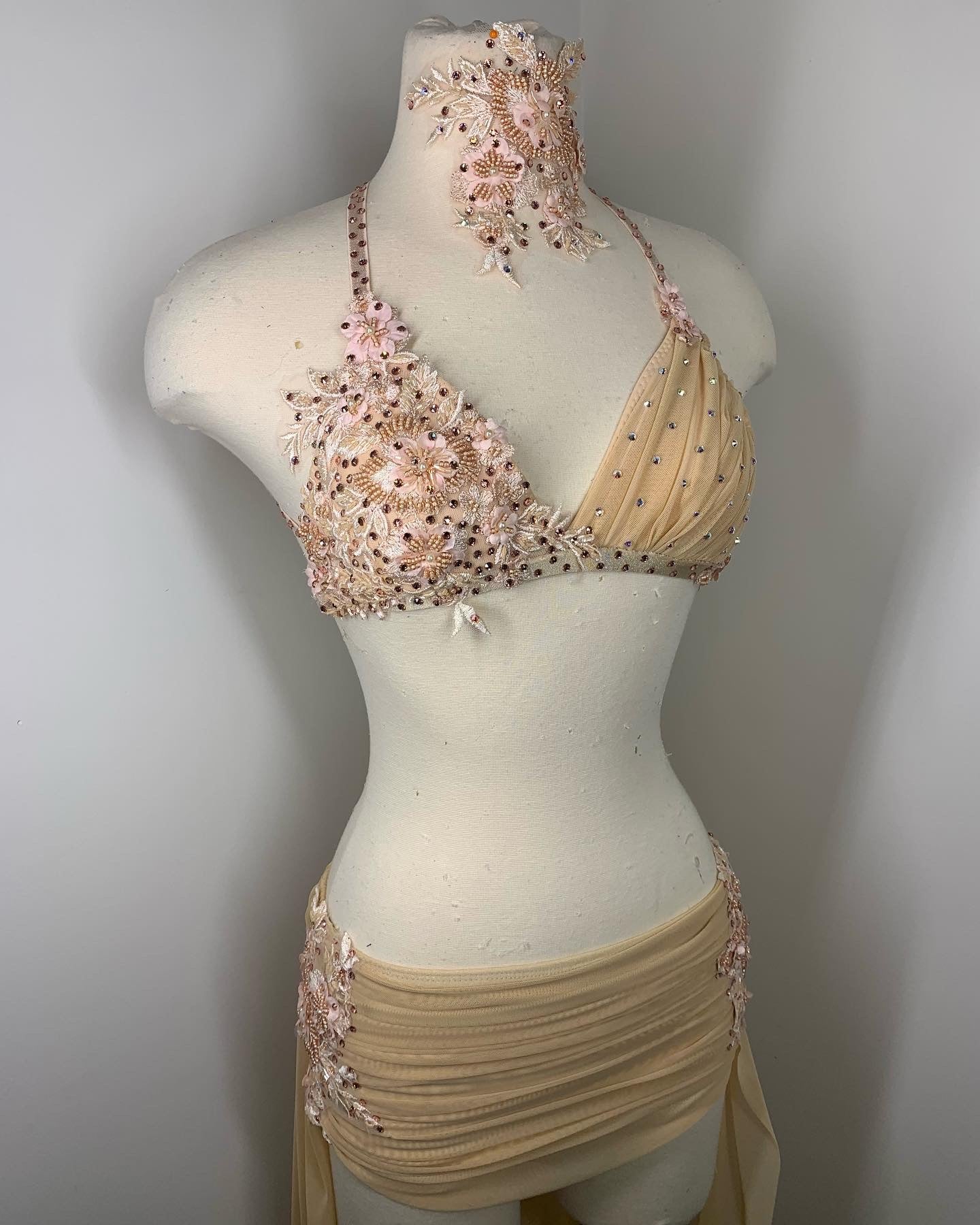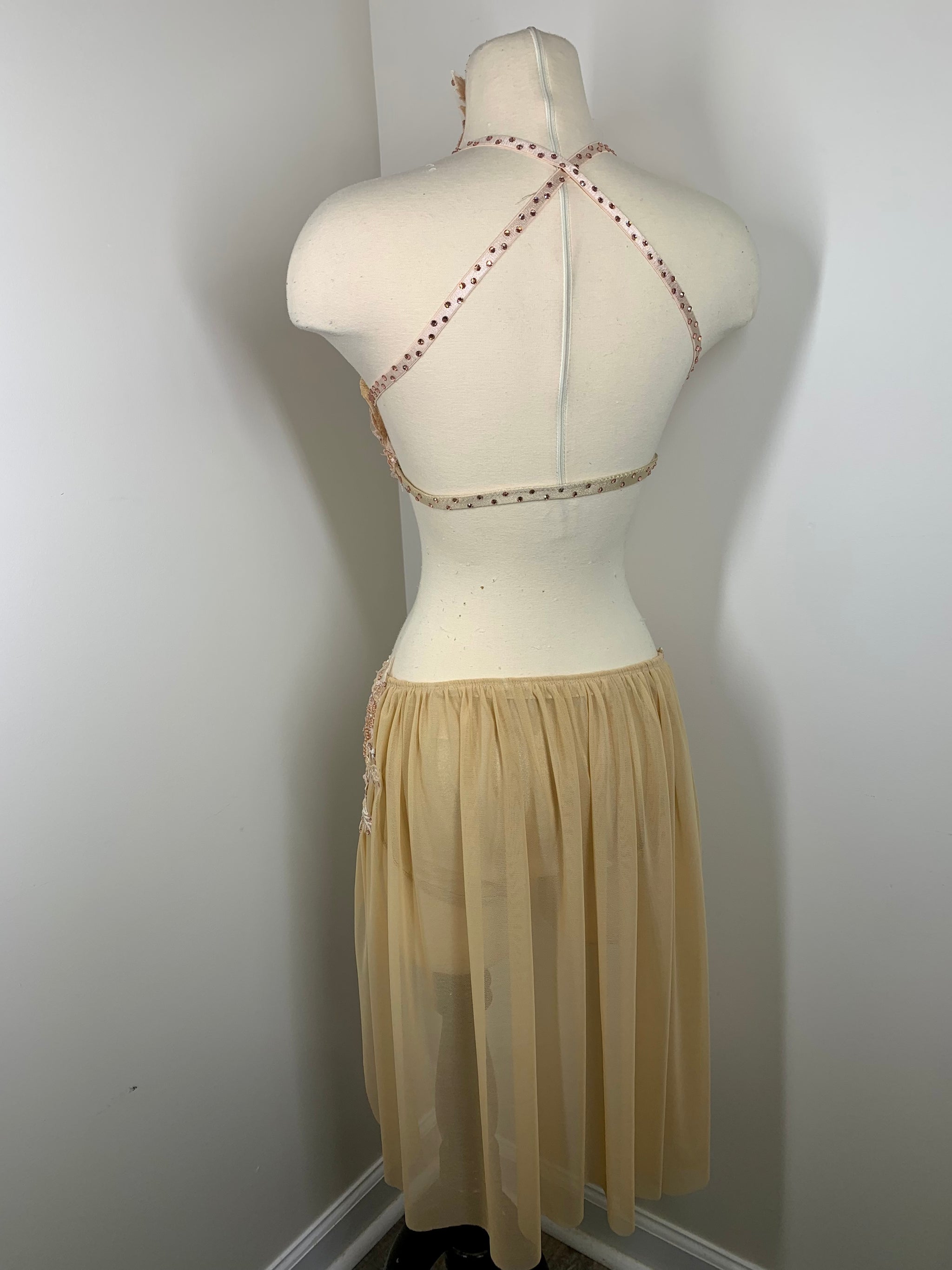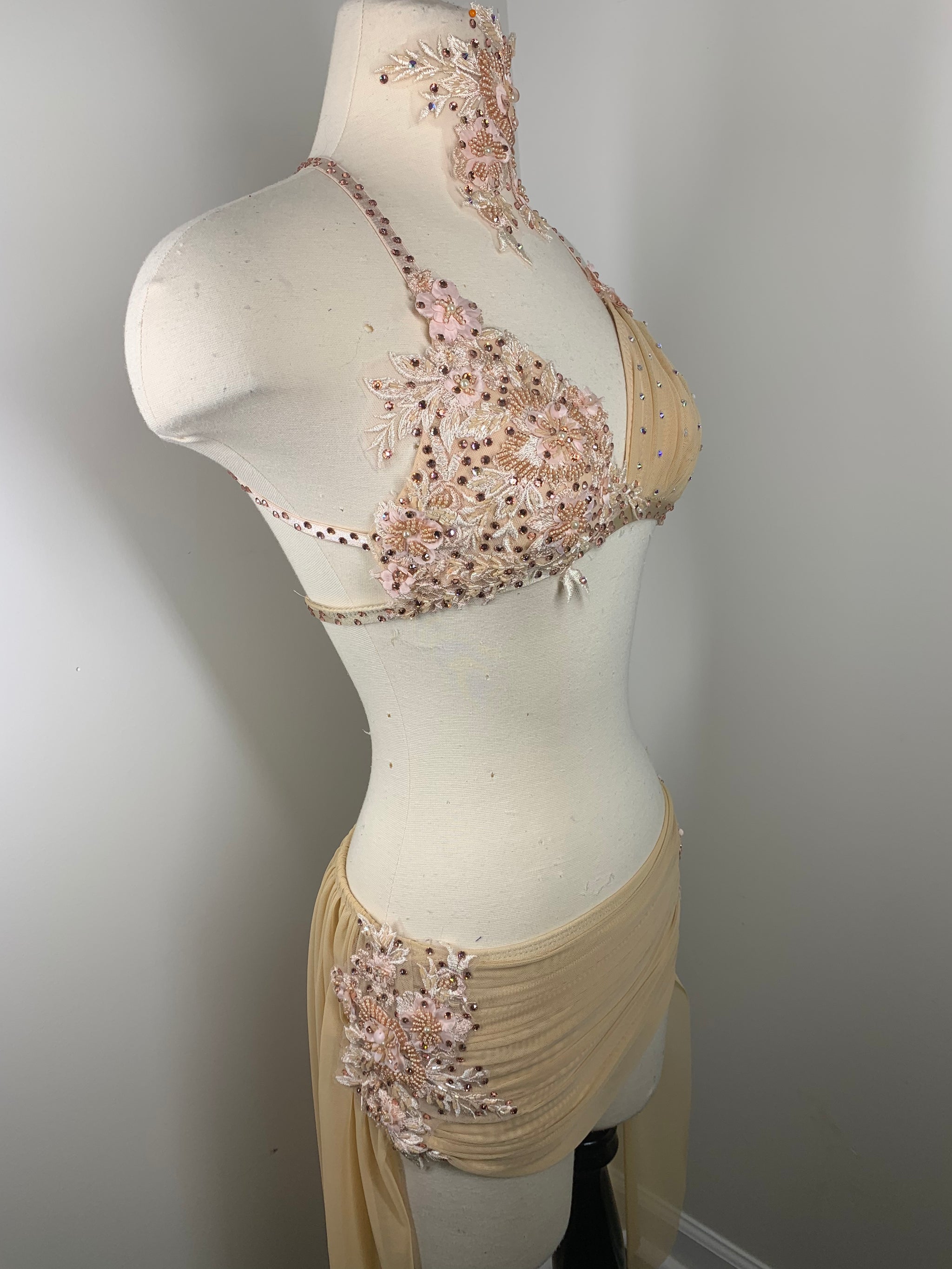 Nude lyrical dance costume with peach beaded appliques with matching hairpiece