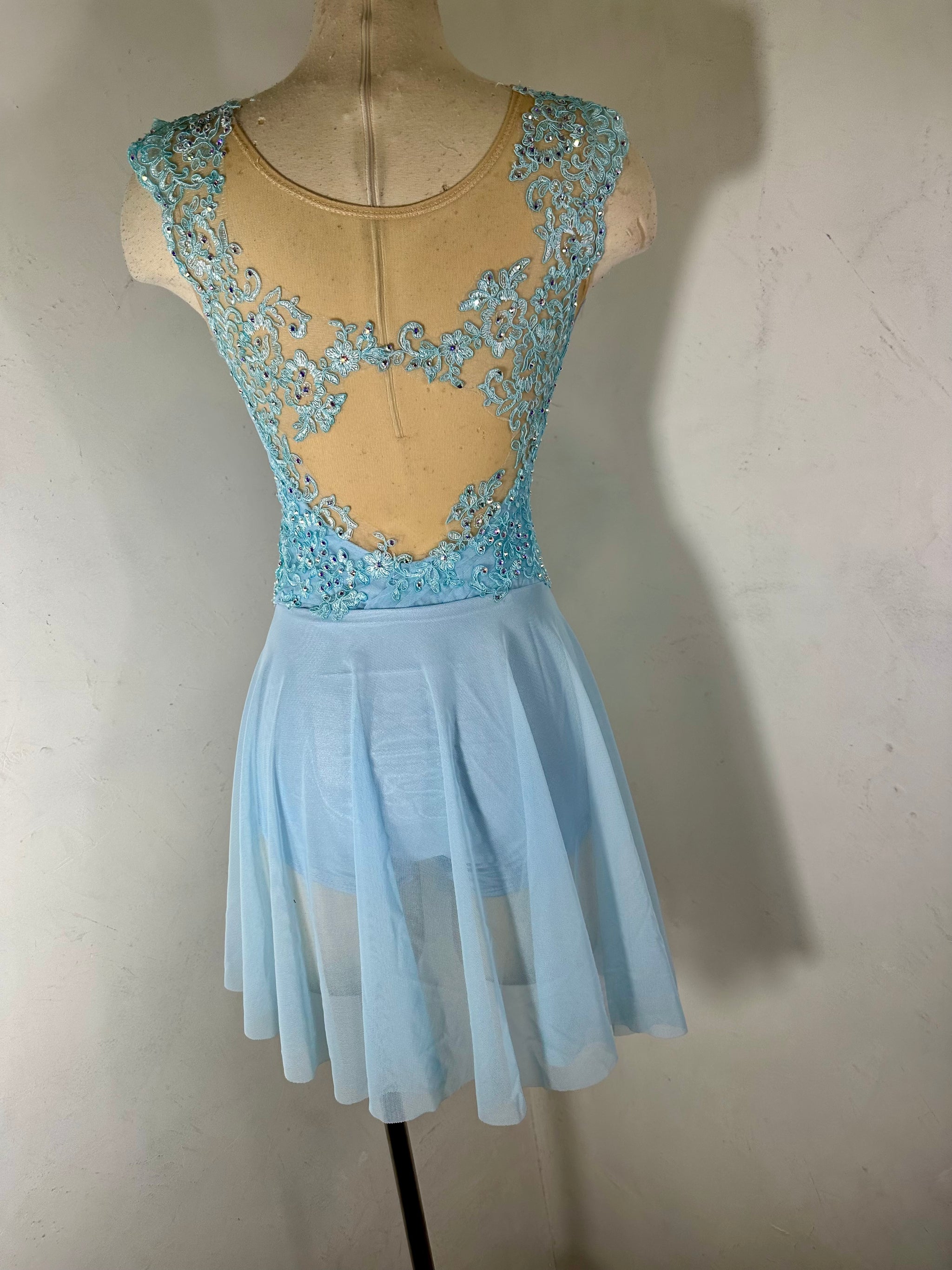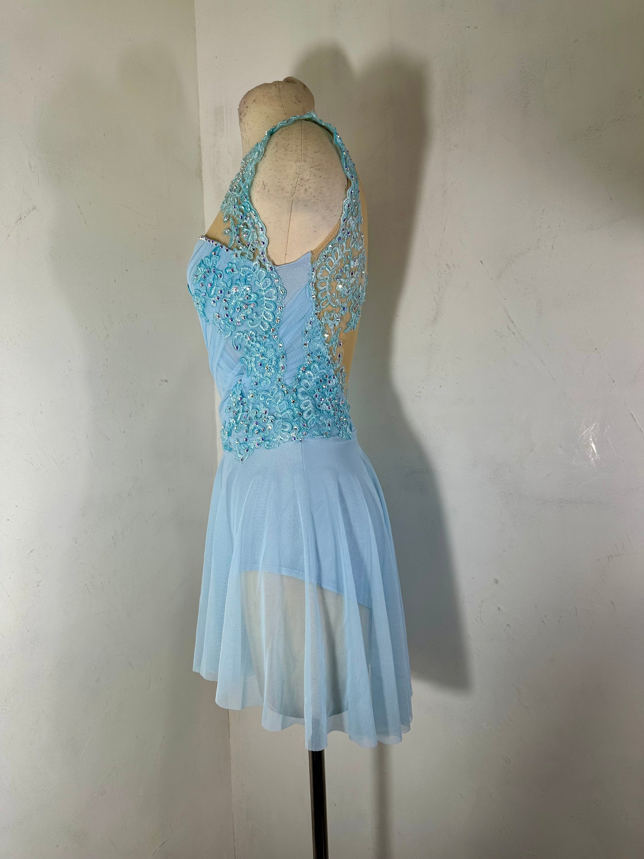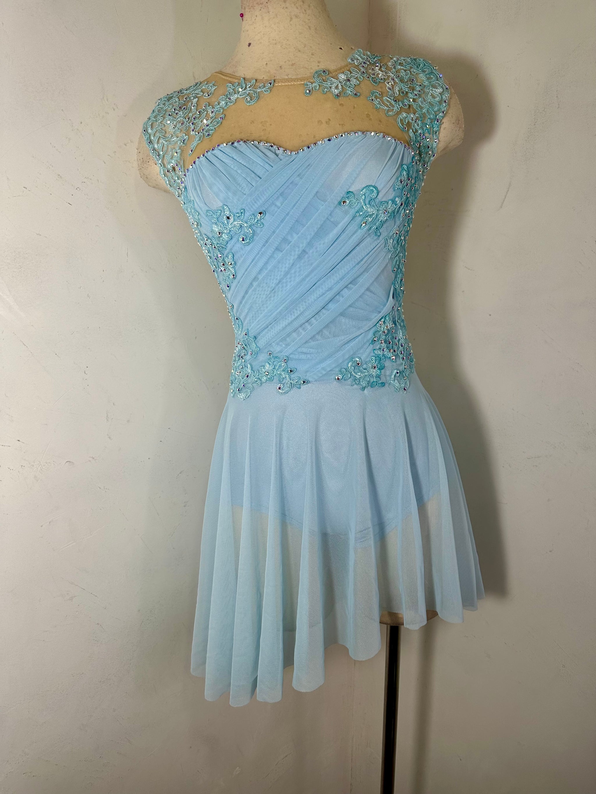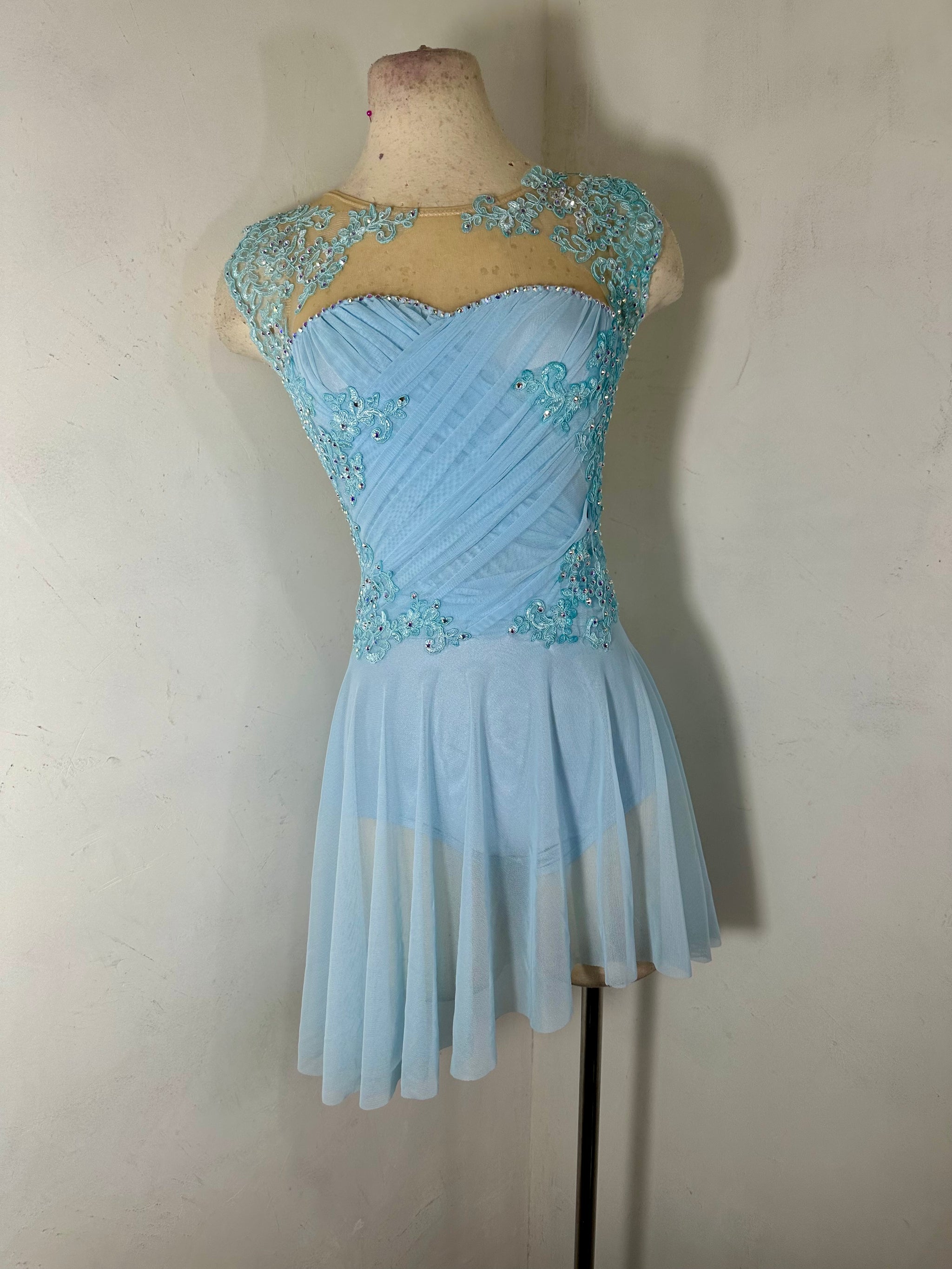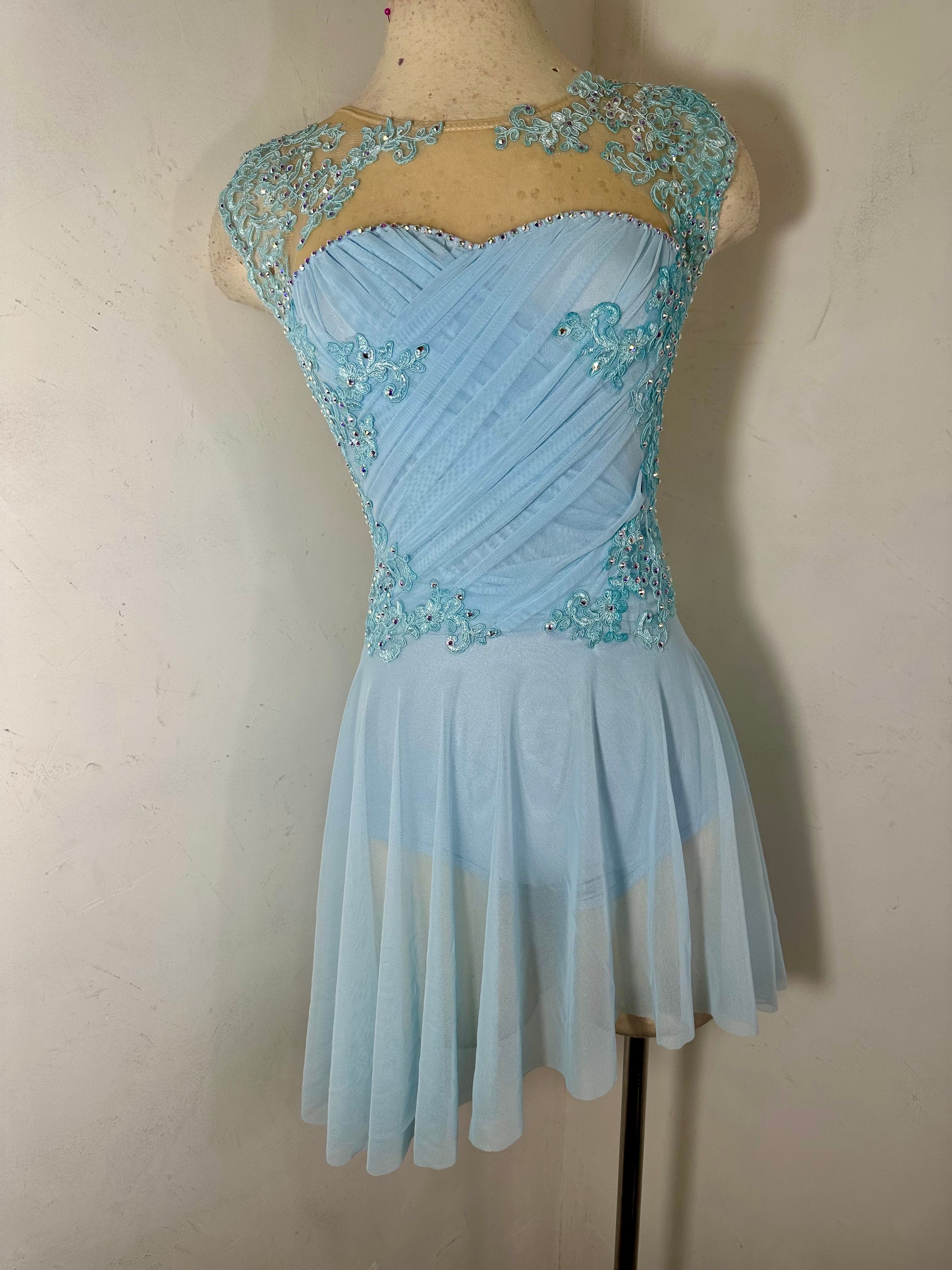Sky blue draped figure skating dress with matching applique trim and Preciosa crystal ab colored rhinestones