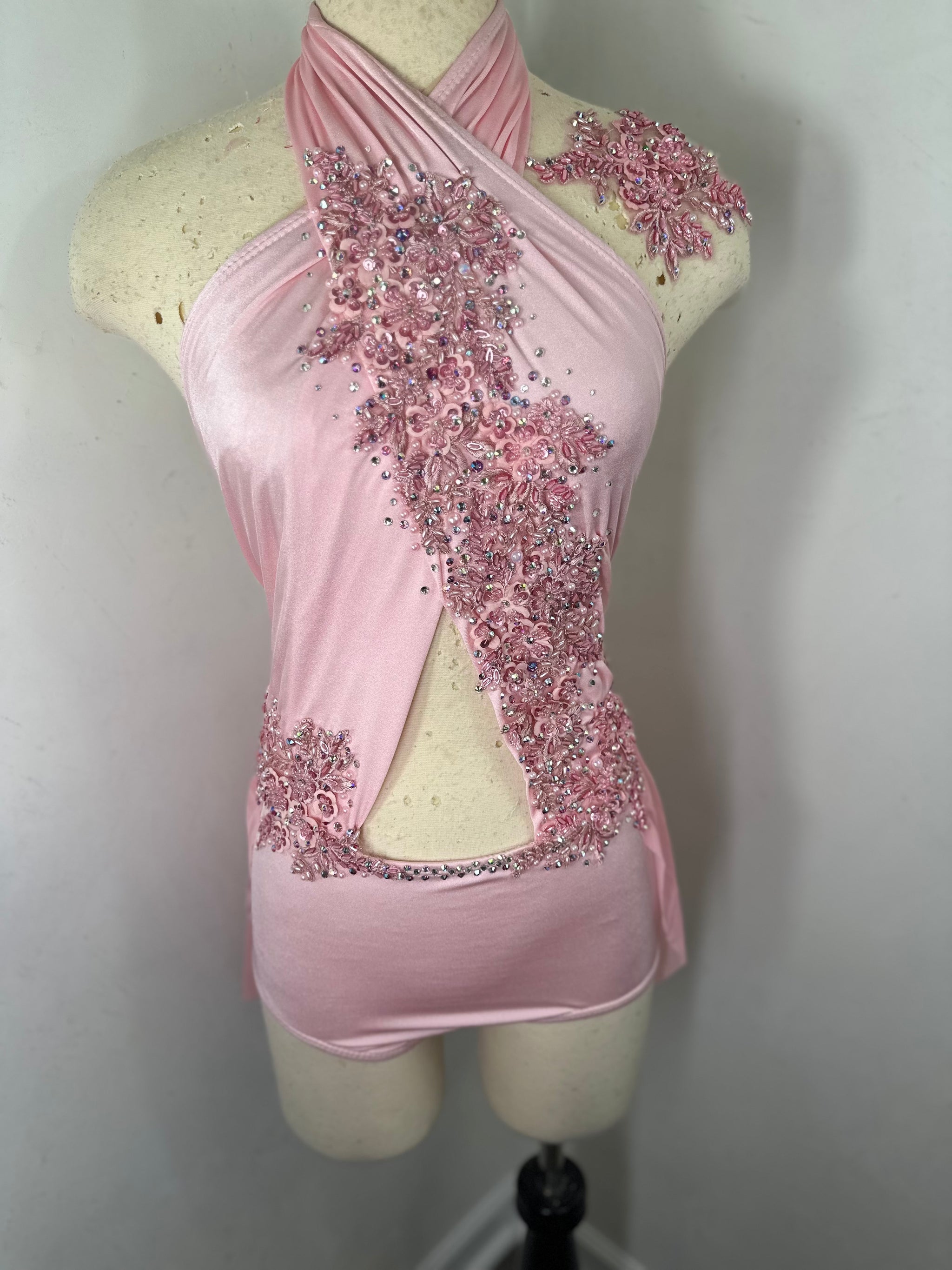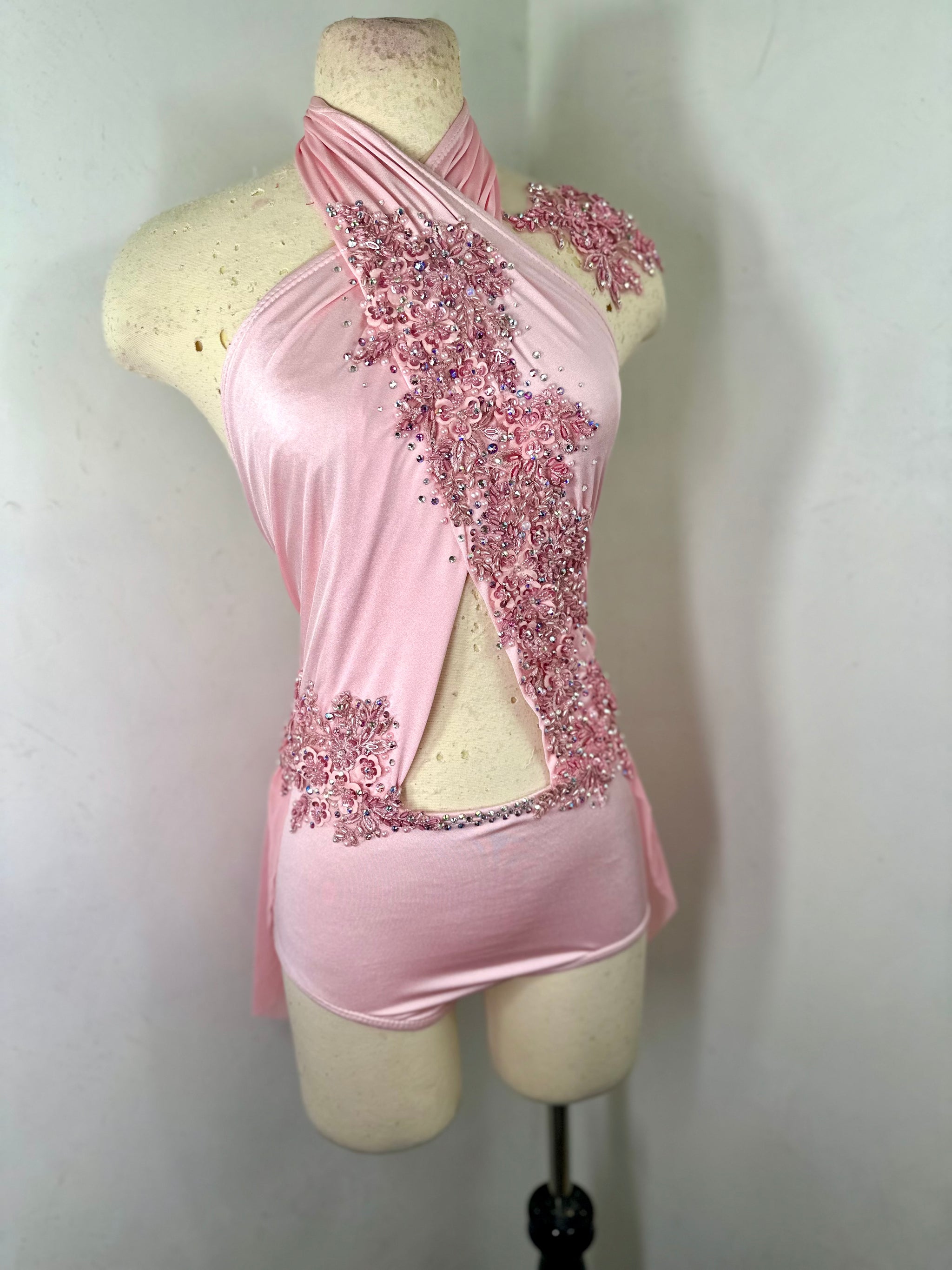 Blush pink beaded applique dance costume with preciosa crystal ab rhinestones
