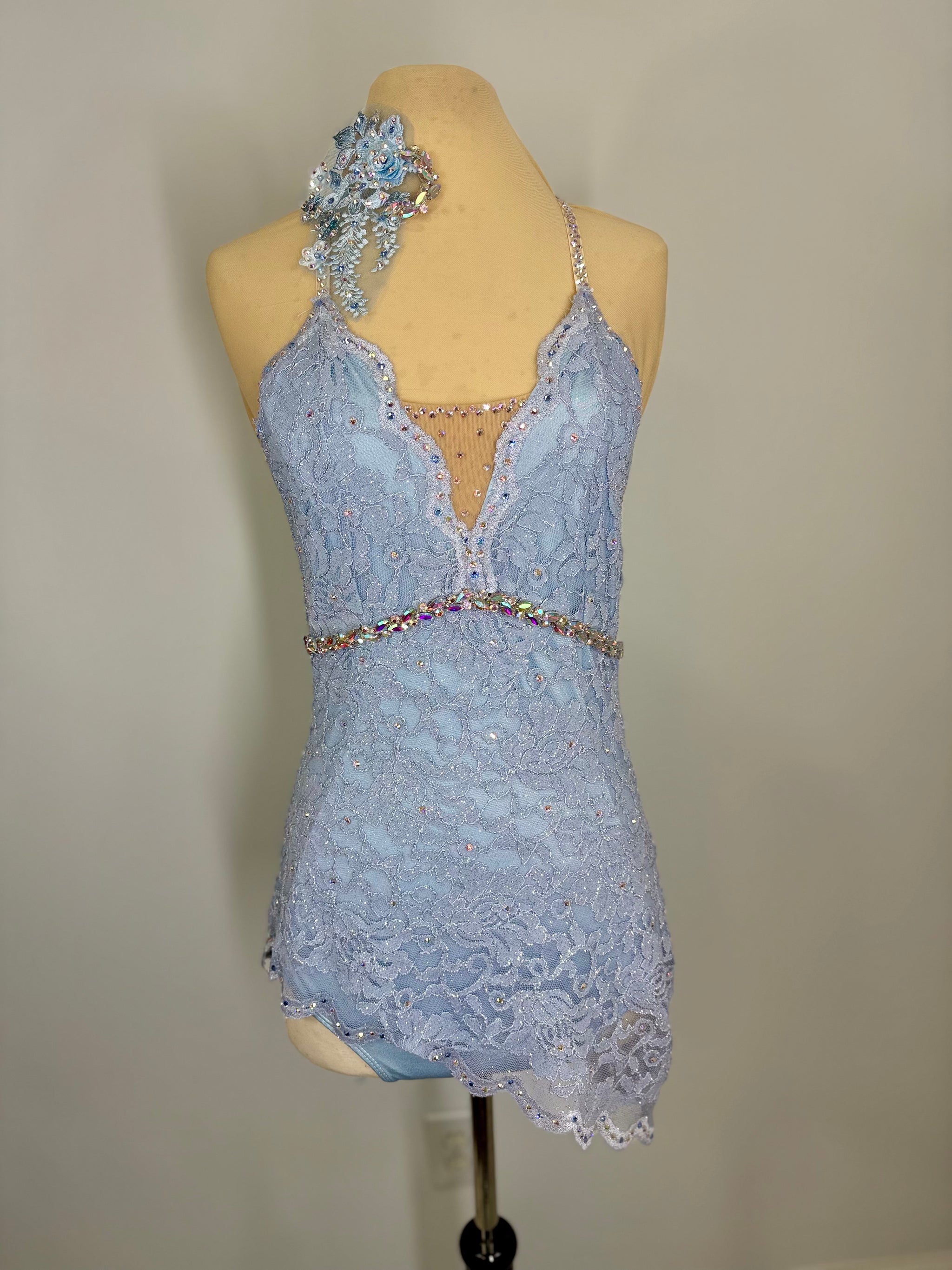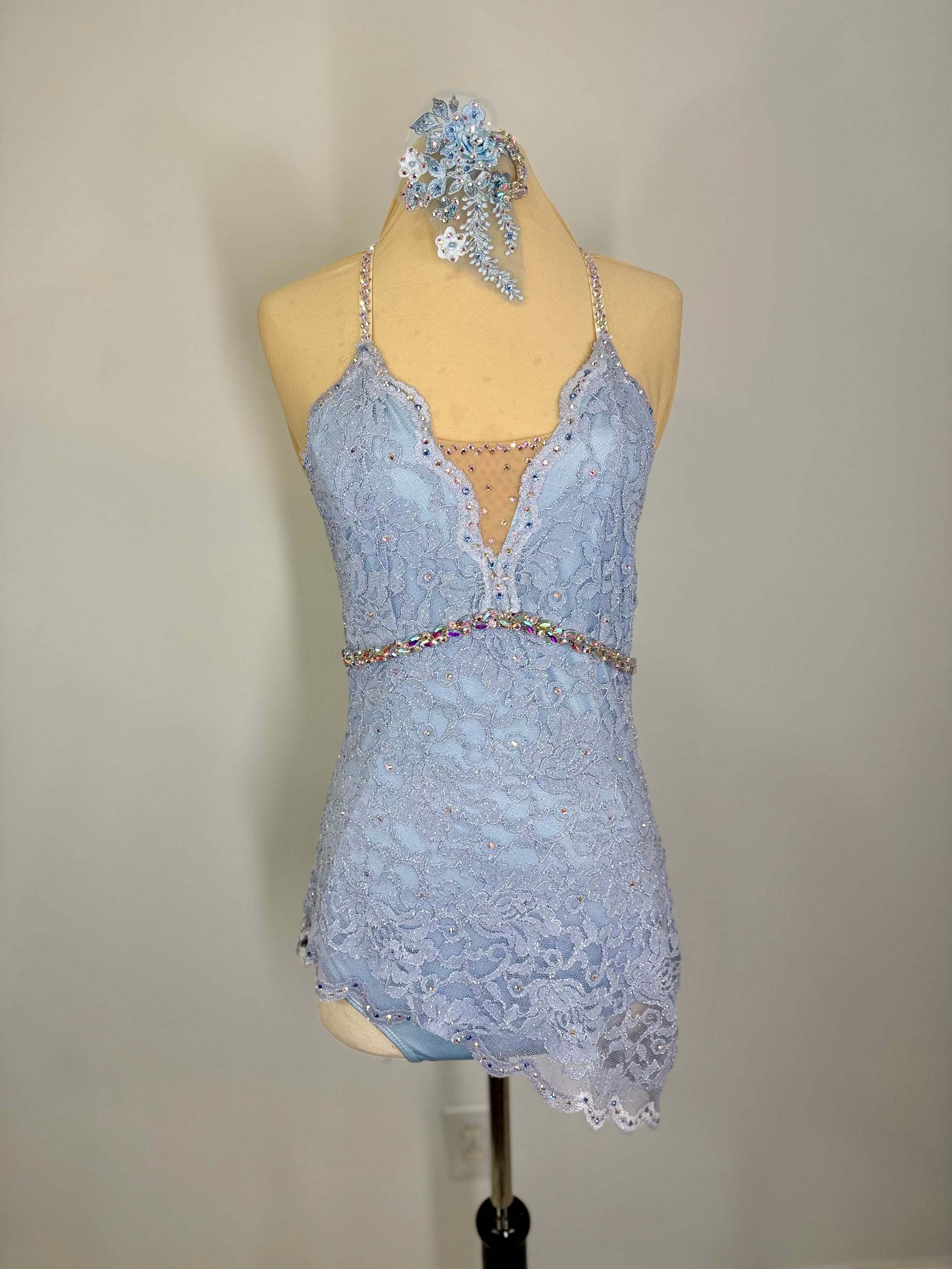 Custom sparkly stretch lace dance costume dress with lined leotard underneath. No Headpeice included