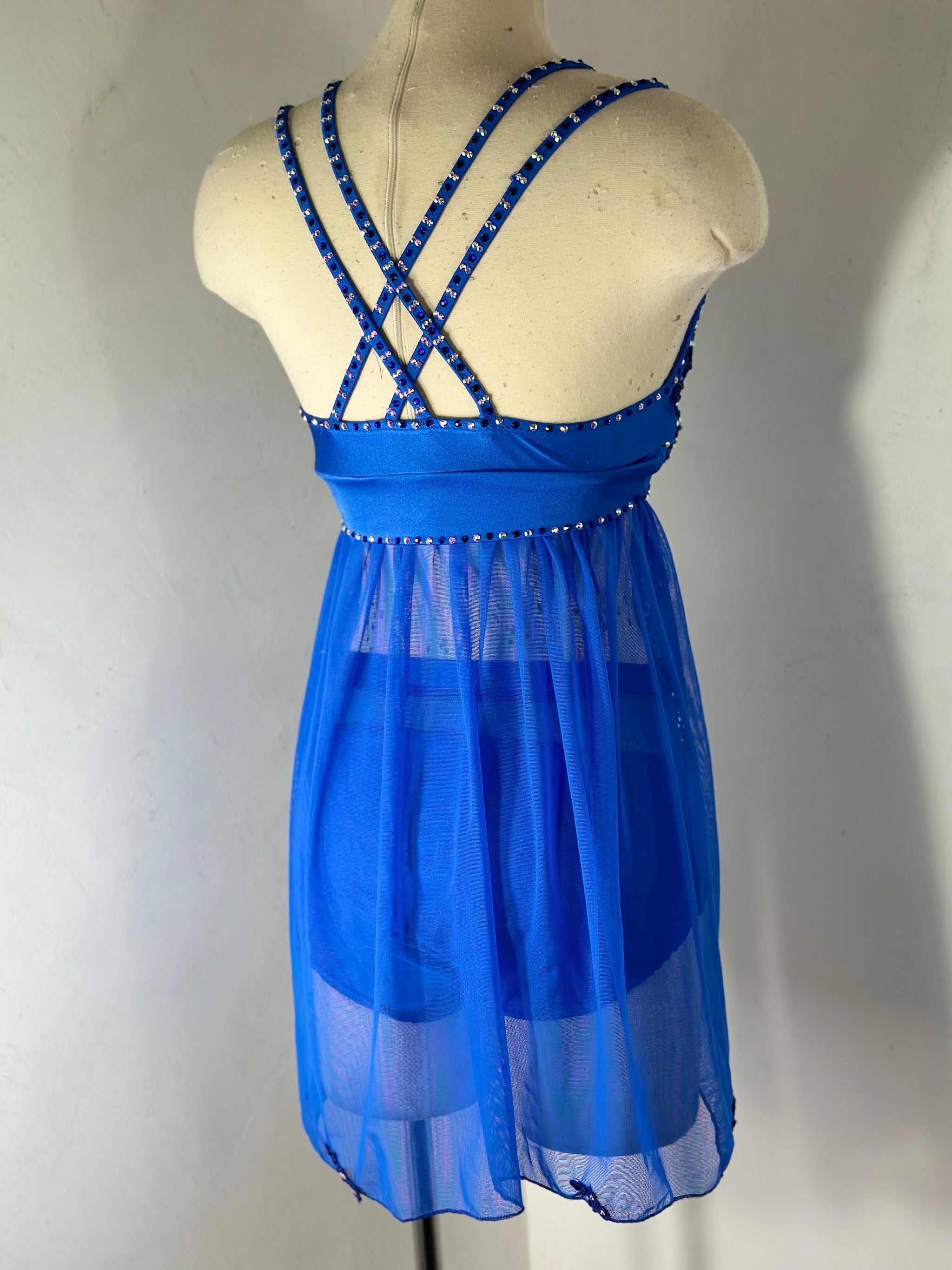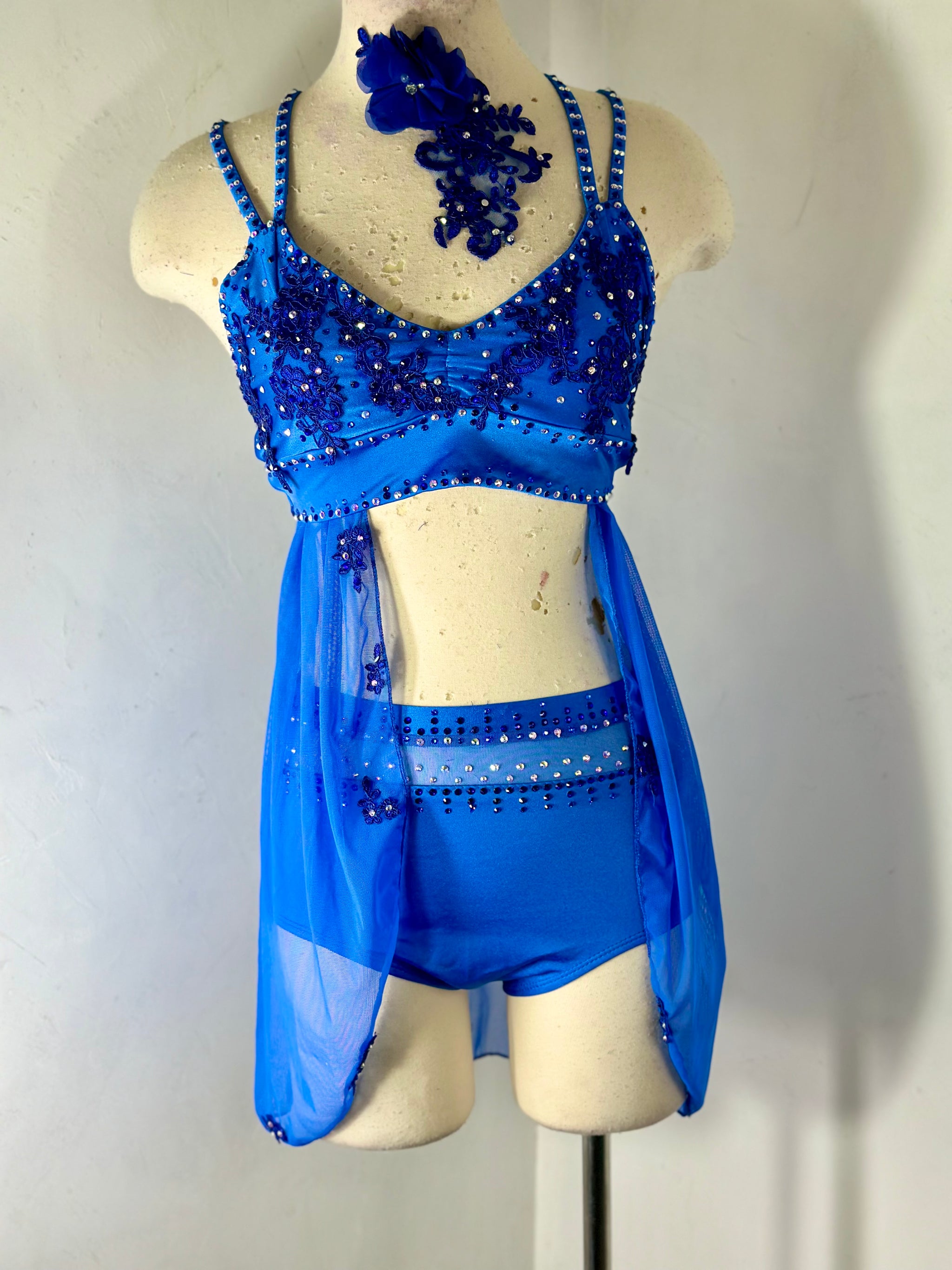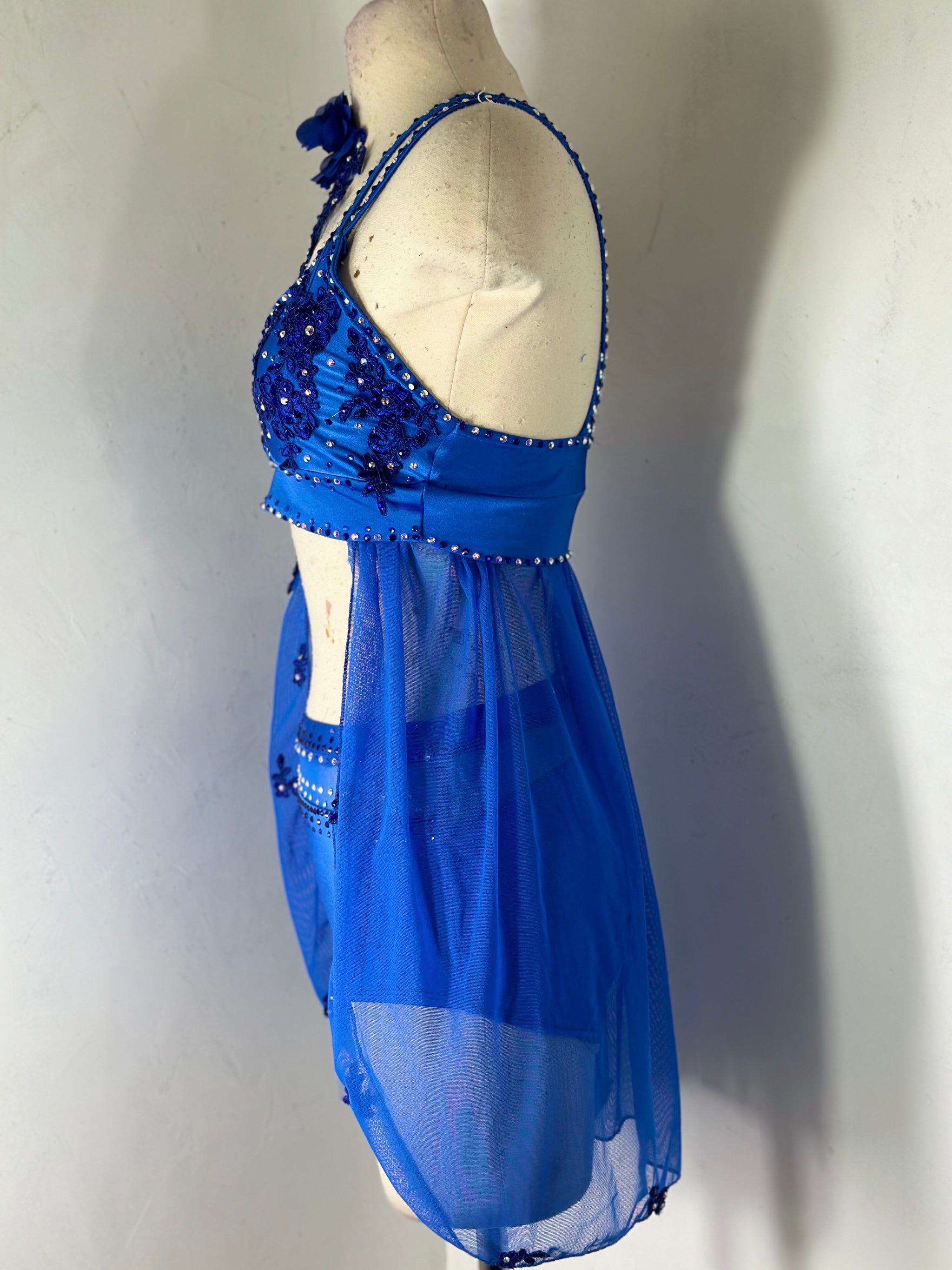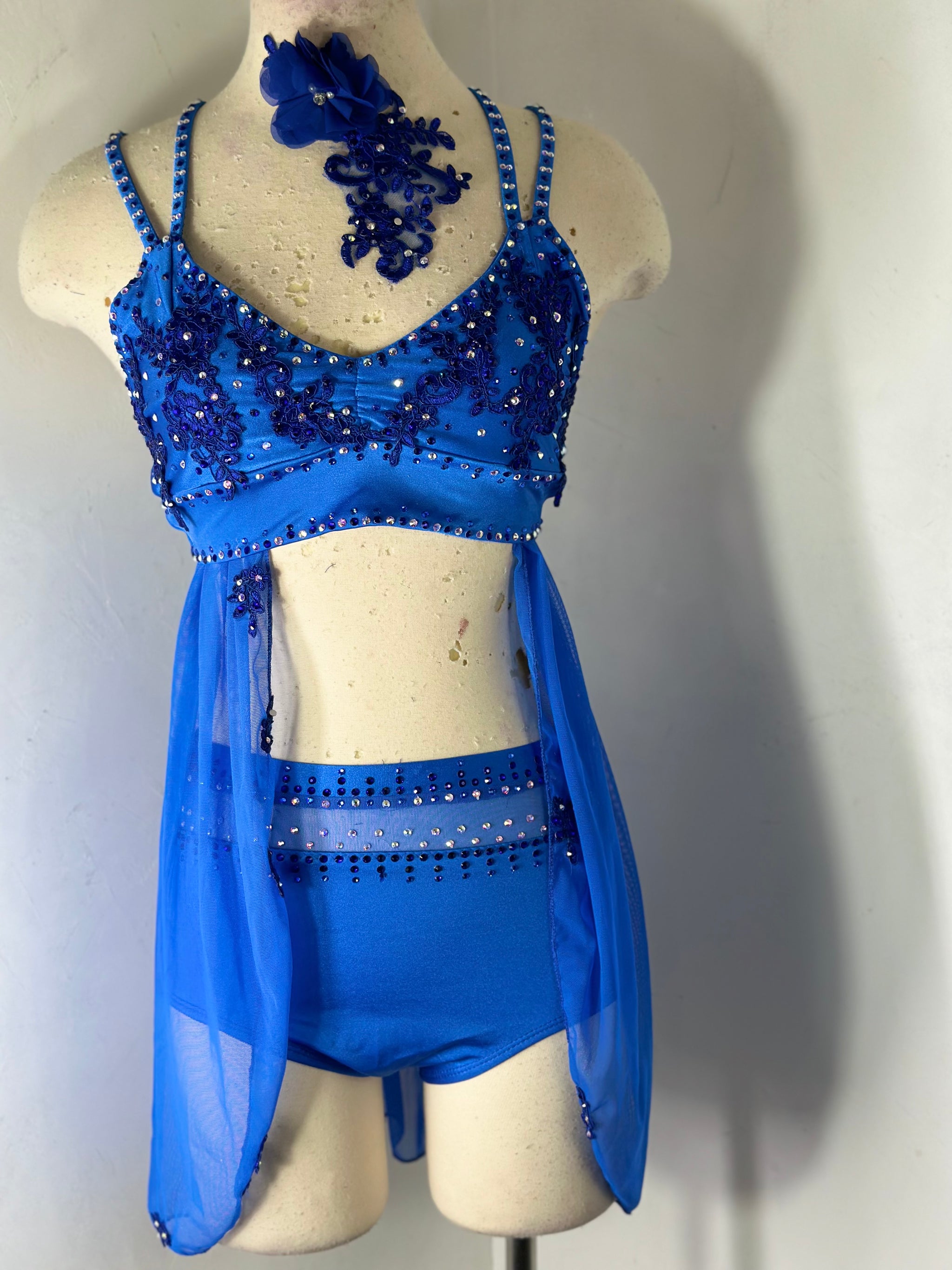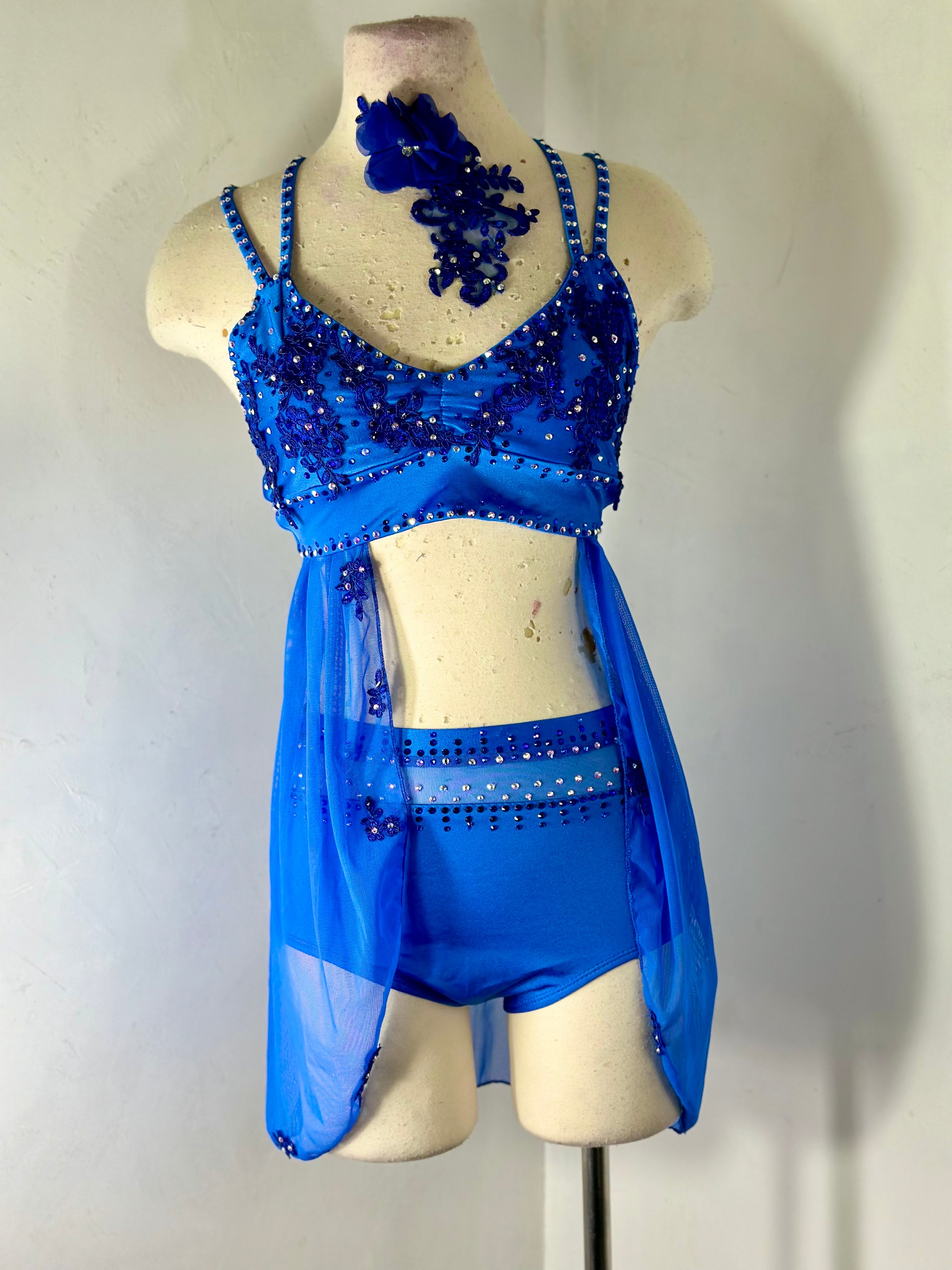 Royal Blue skirted dance top with appliqués tons of preciosa crystal ab and coordinating color rhinestones , bra pads sewn in, and matching mesh topped briefs.