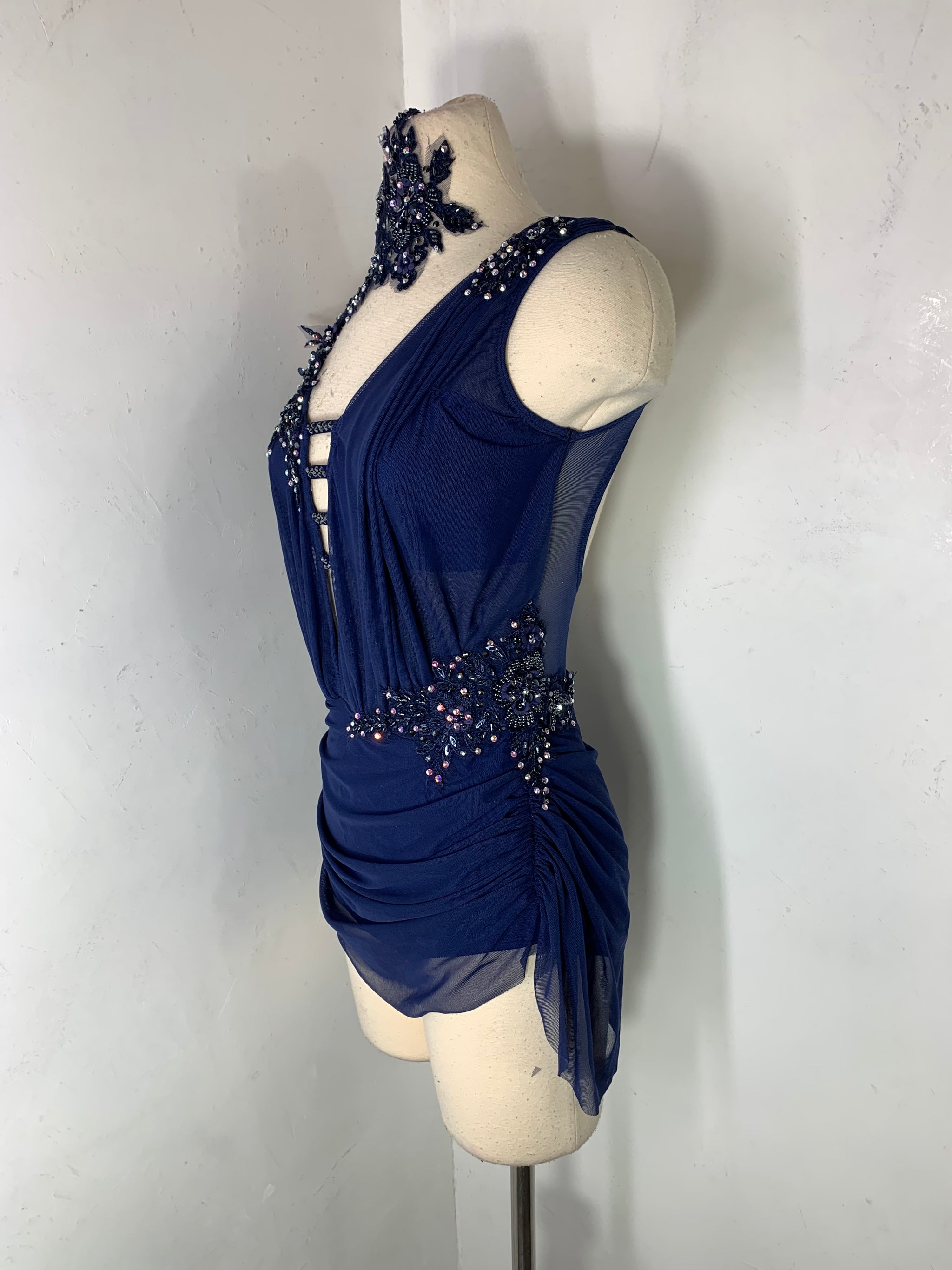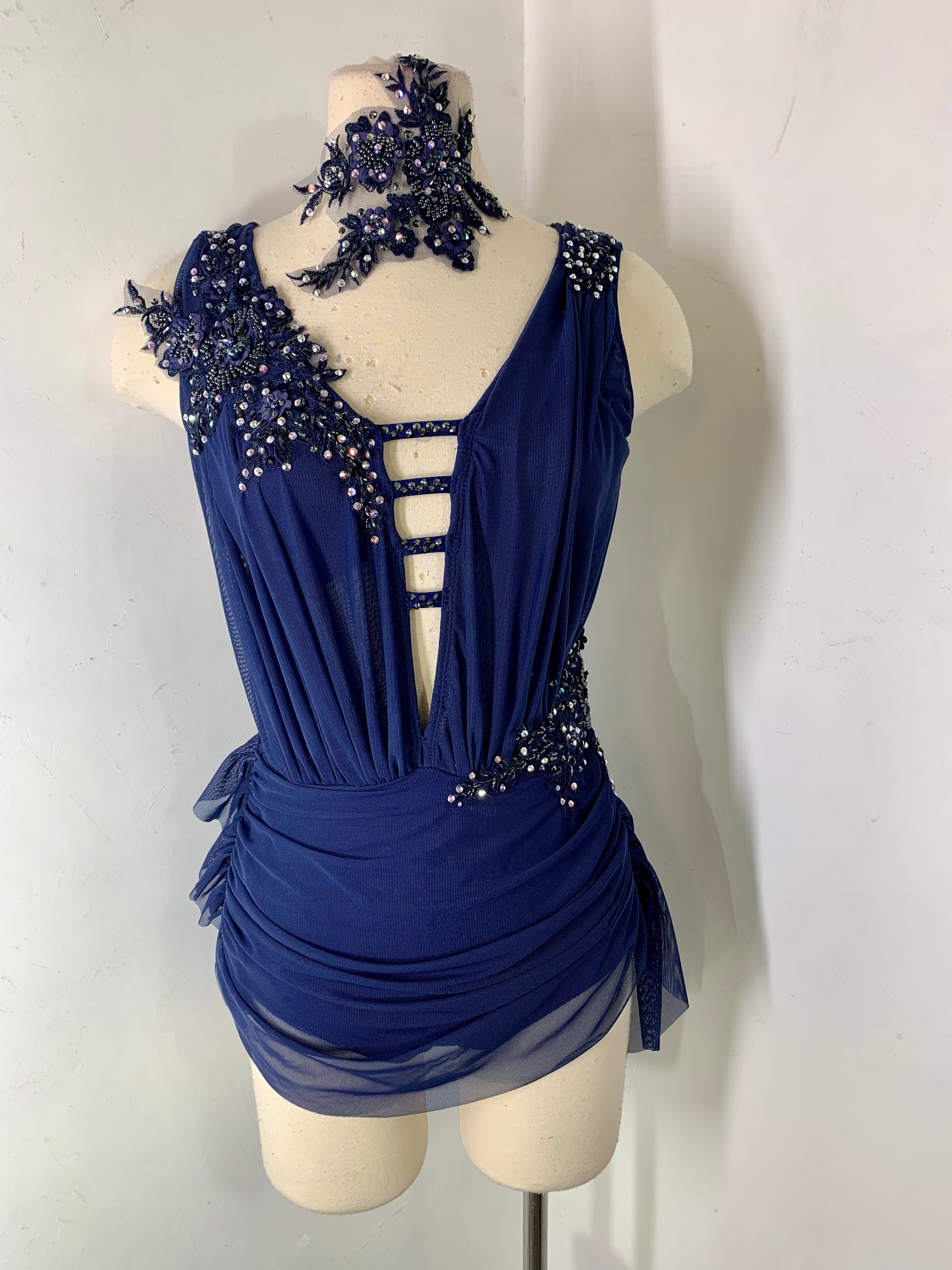 navy lyrical dance costume in SA with crystal ab and hematite stones