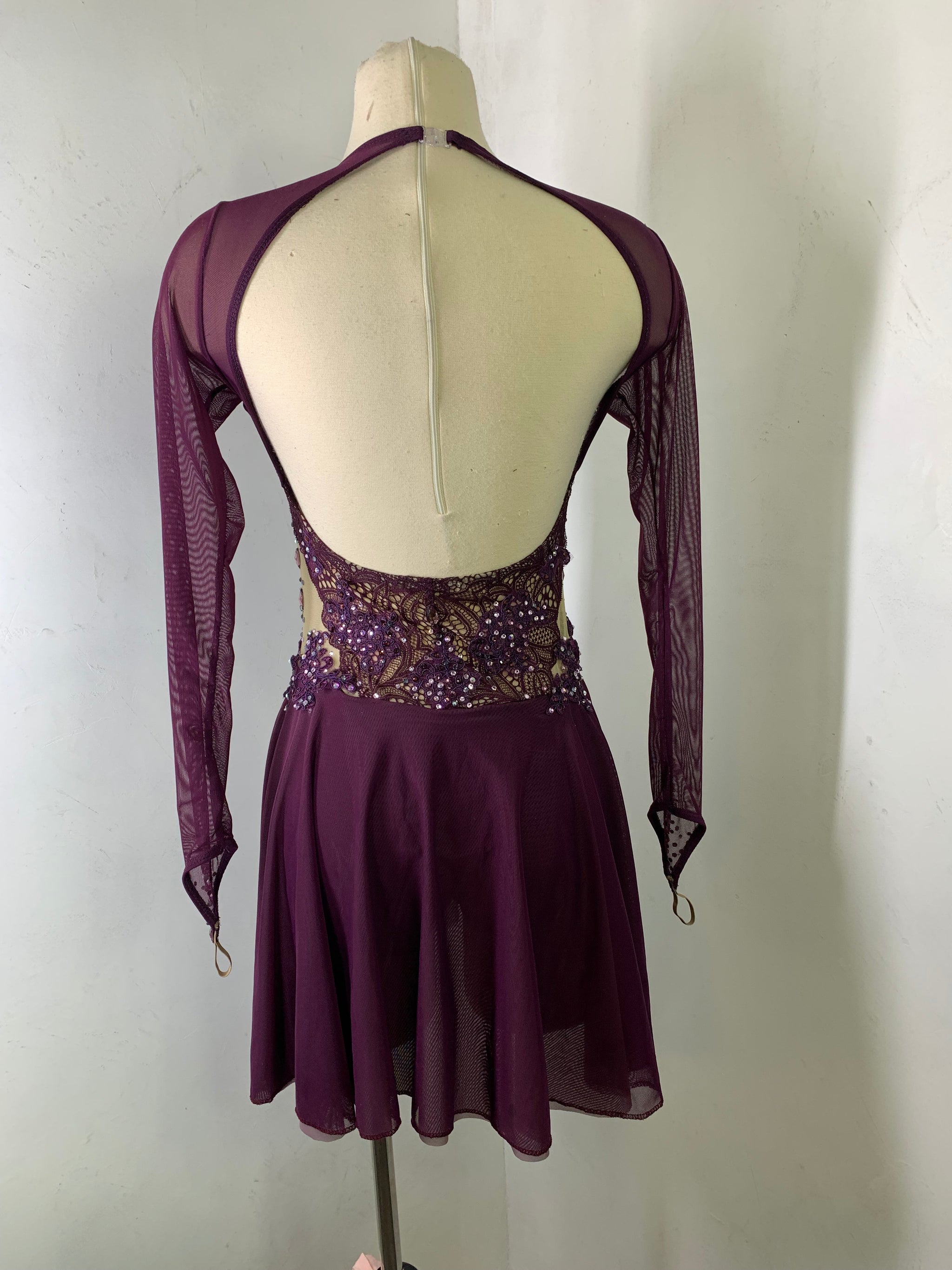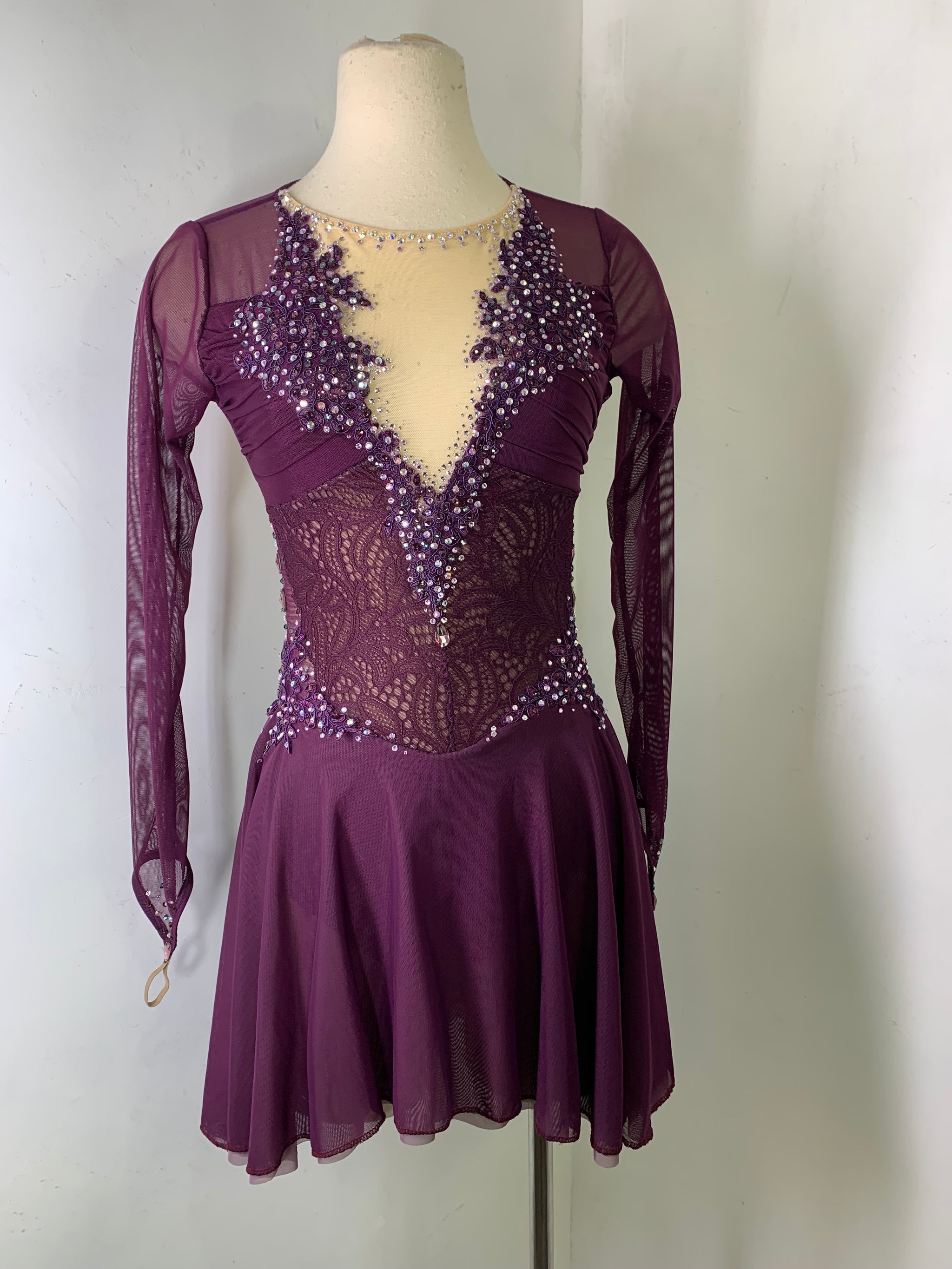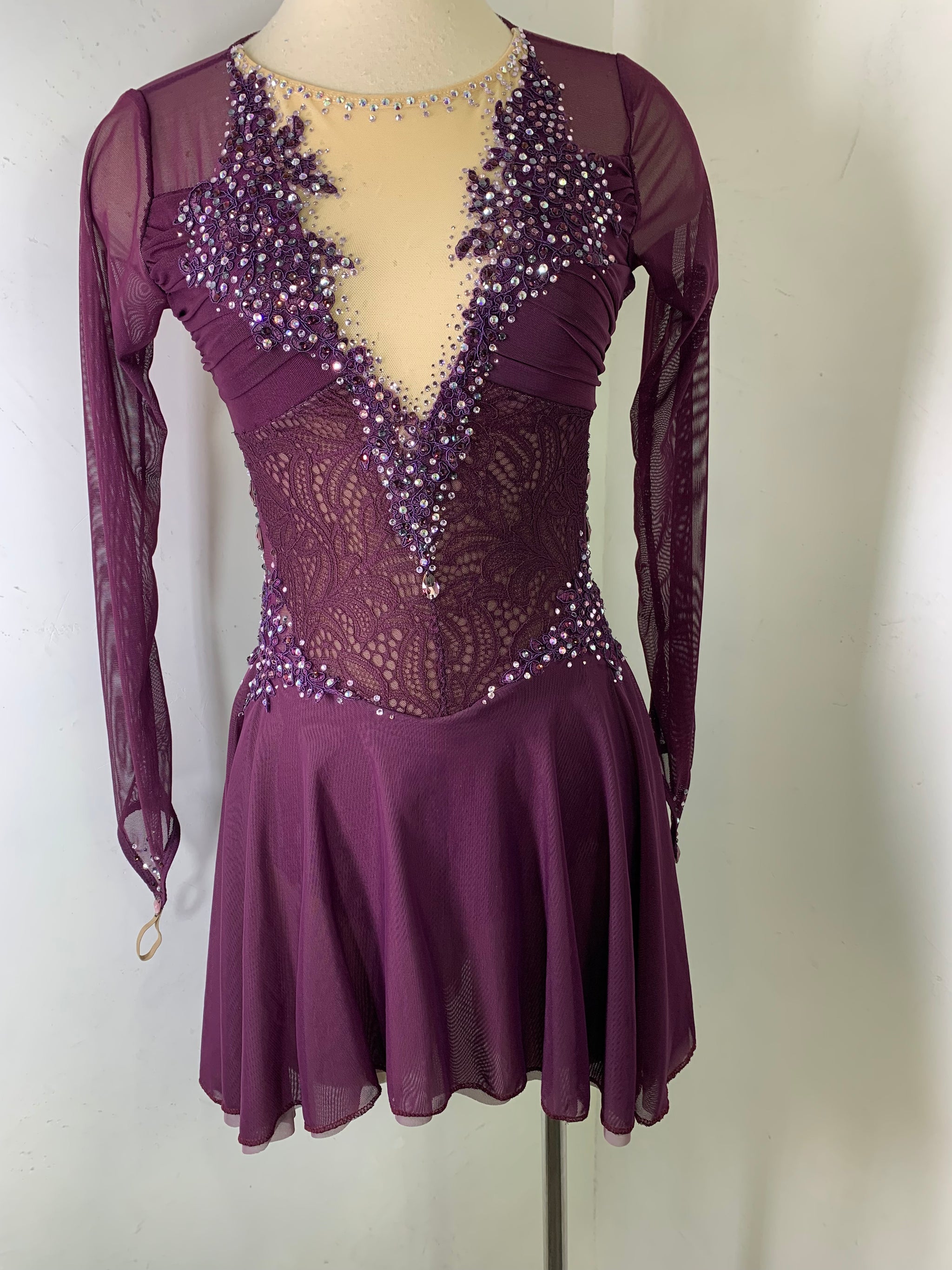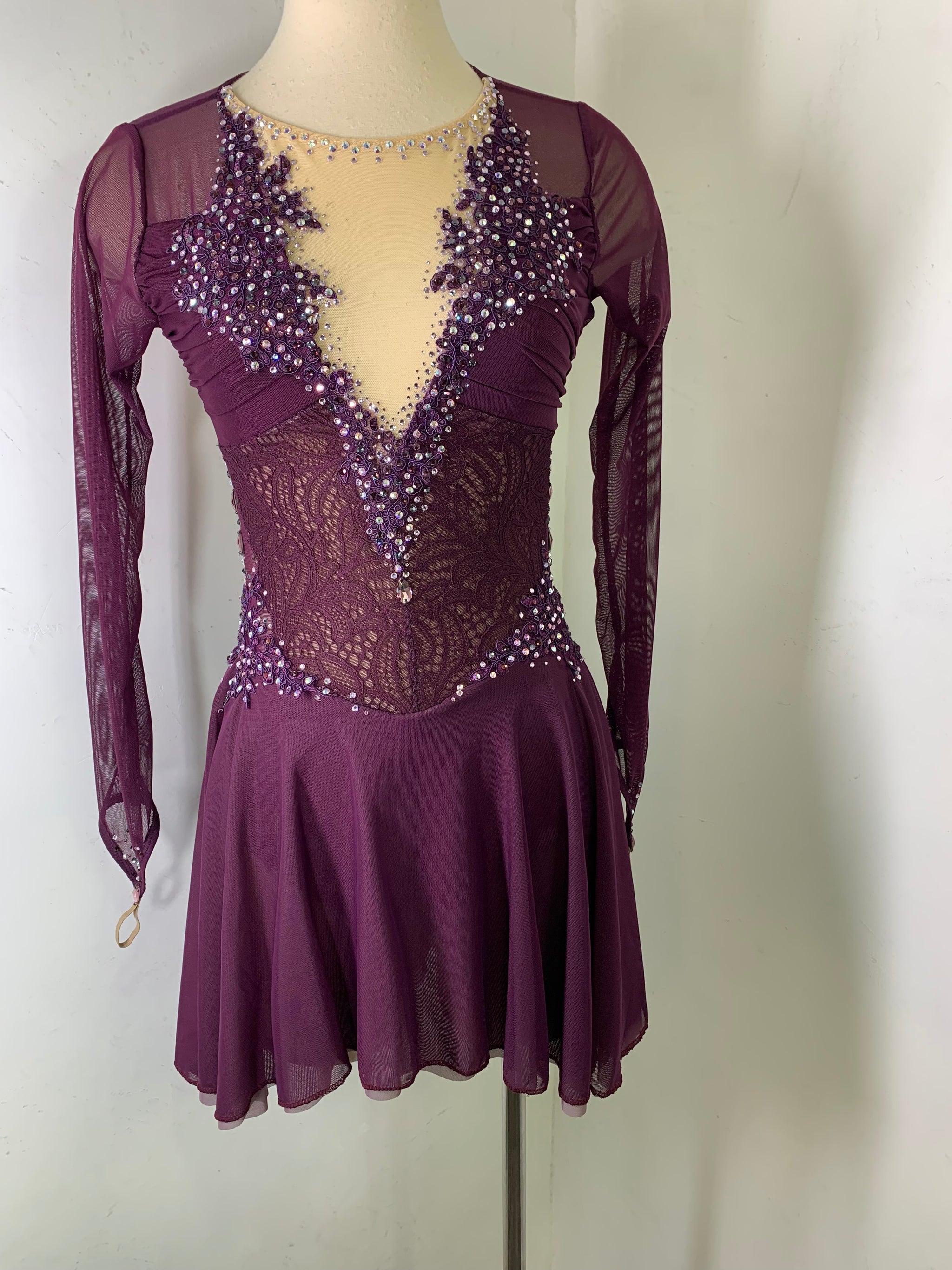 Merlot long sleeved Figure Skating Dress with a merlot lace bodice, merlot appliques and Preciosa crystal ab and colored rhinestones