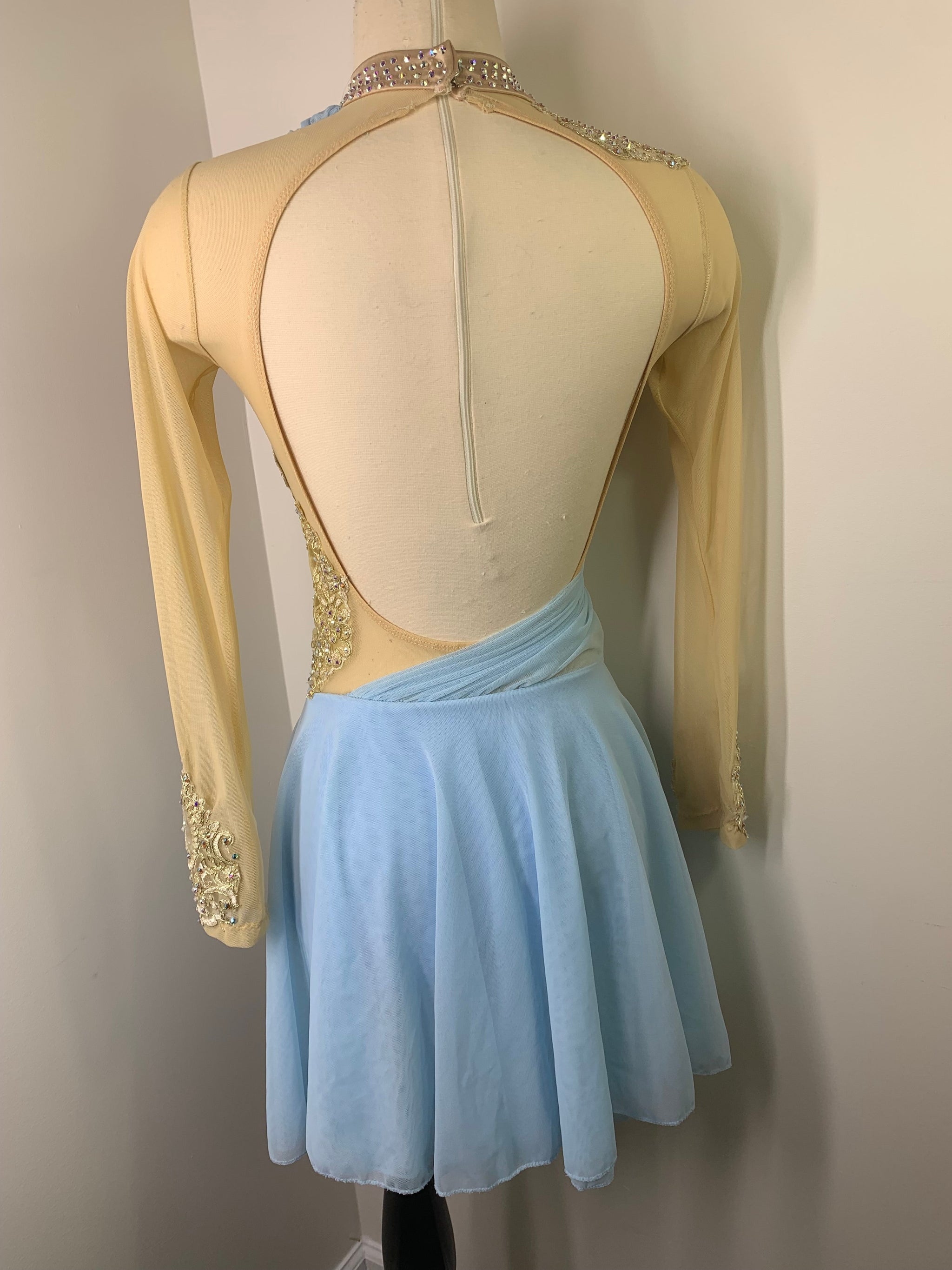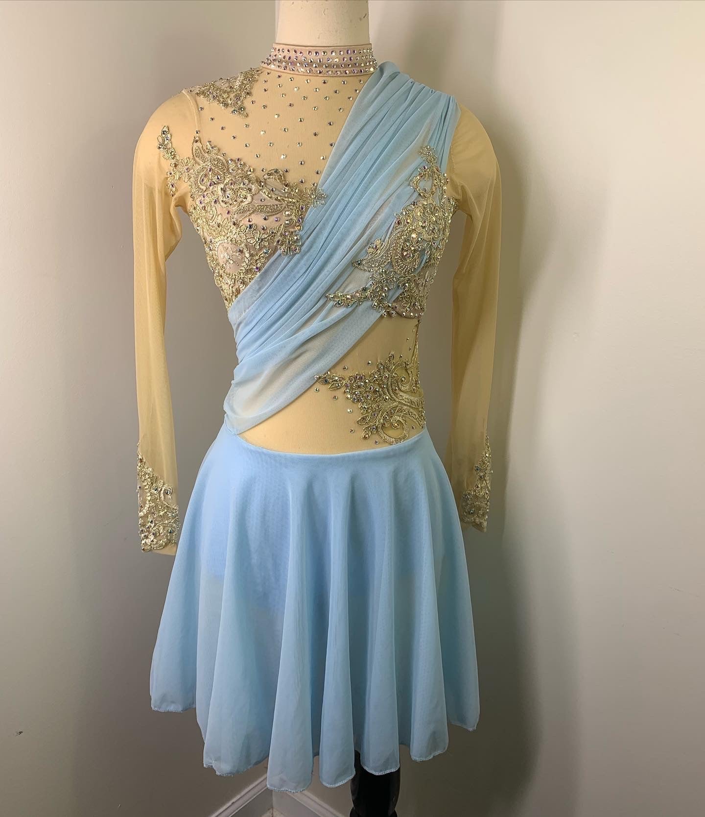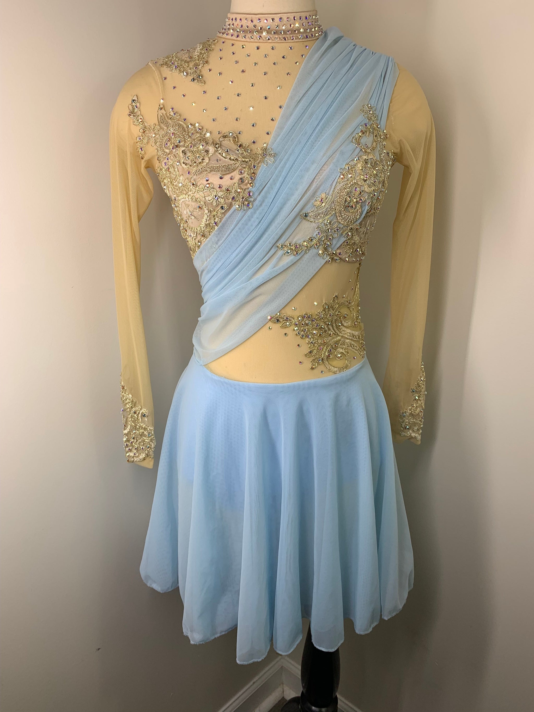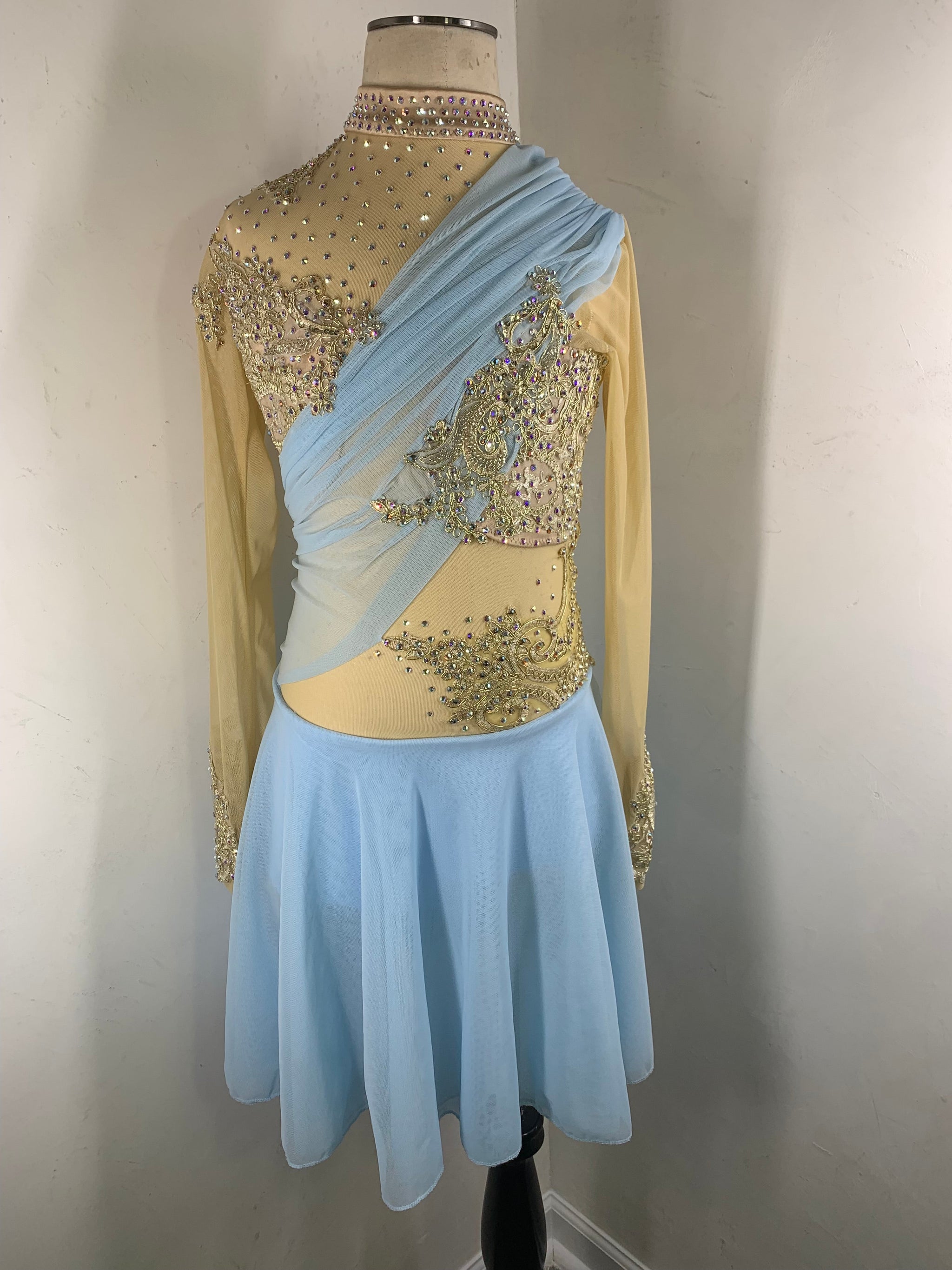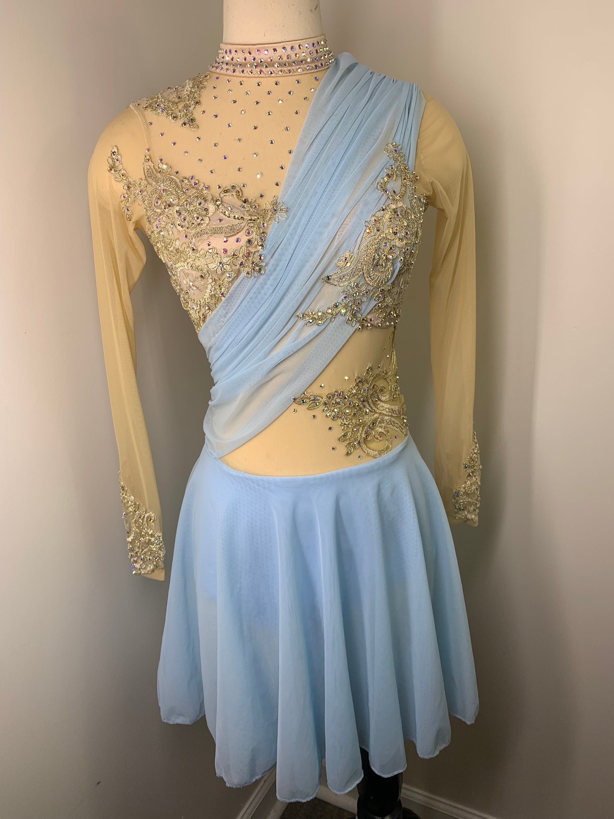 Sky blue and gold figure skating dress with draping detail and gorgeous gold metallic lace, 2 layer skirt and Preciosa crystal ab and colored rhinestones