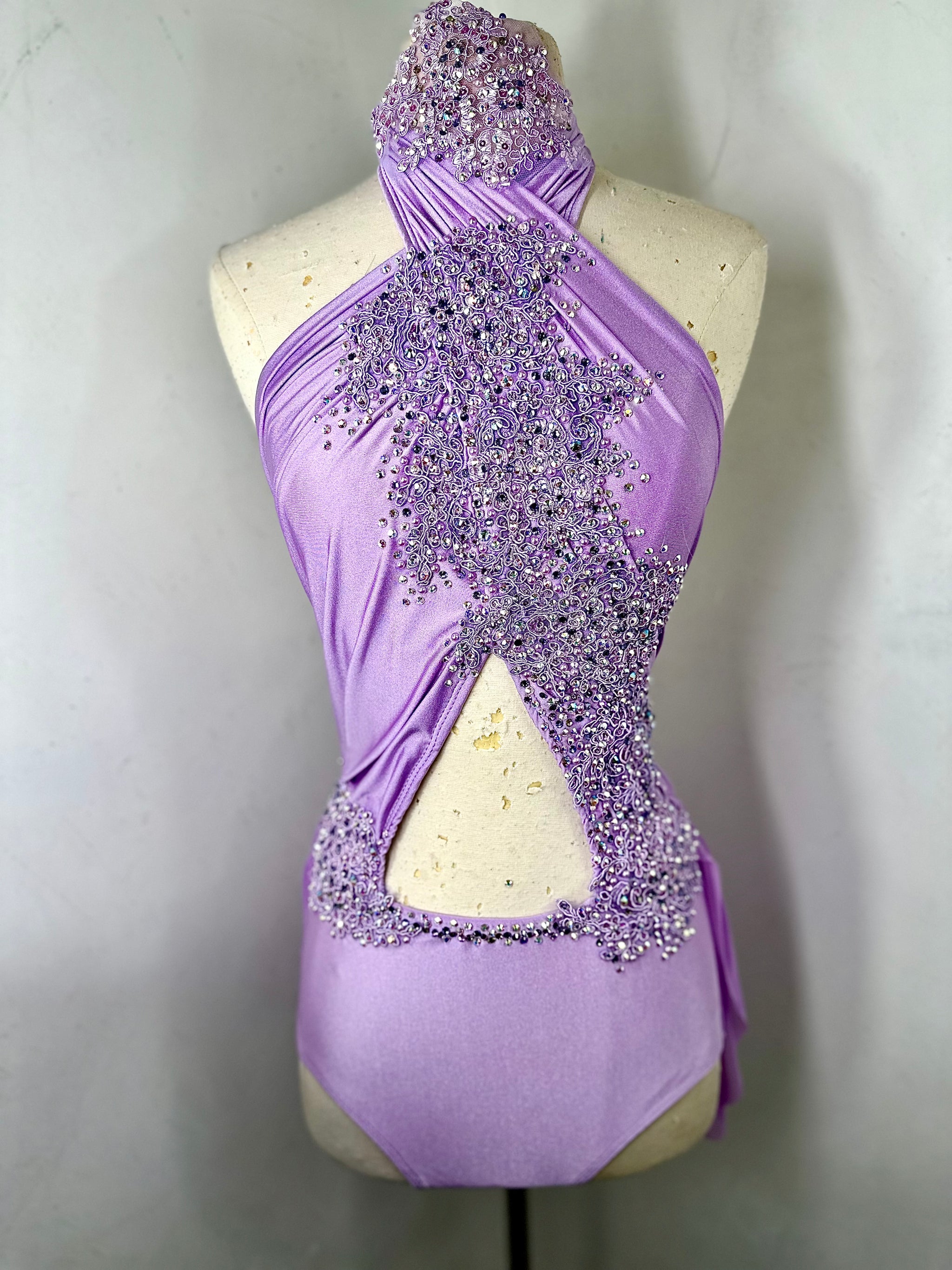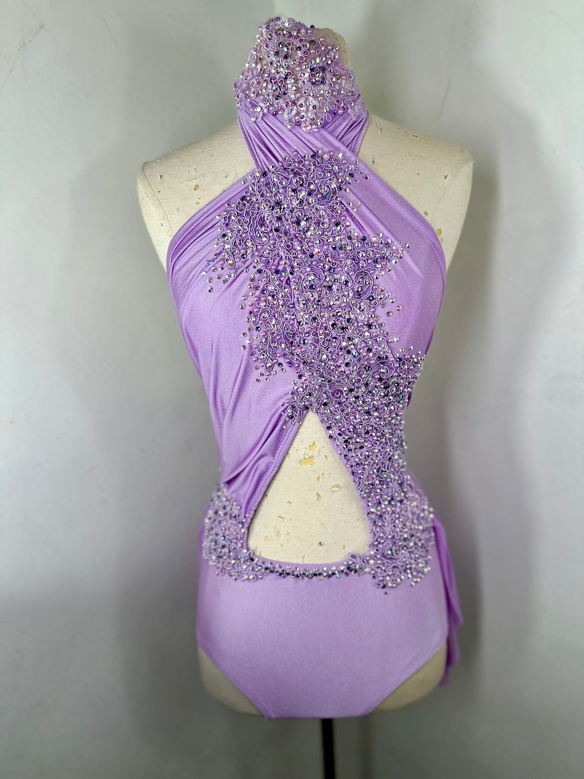 Lyrical dance costume with light orchid appliques and over ten gross crystal ab preciosa rhinestones and additional lilac and similar tones preciosa rhinestones, pearls and ab crystals. This one sleeved lyrical dance costume is fully lined underneath.