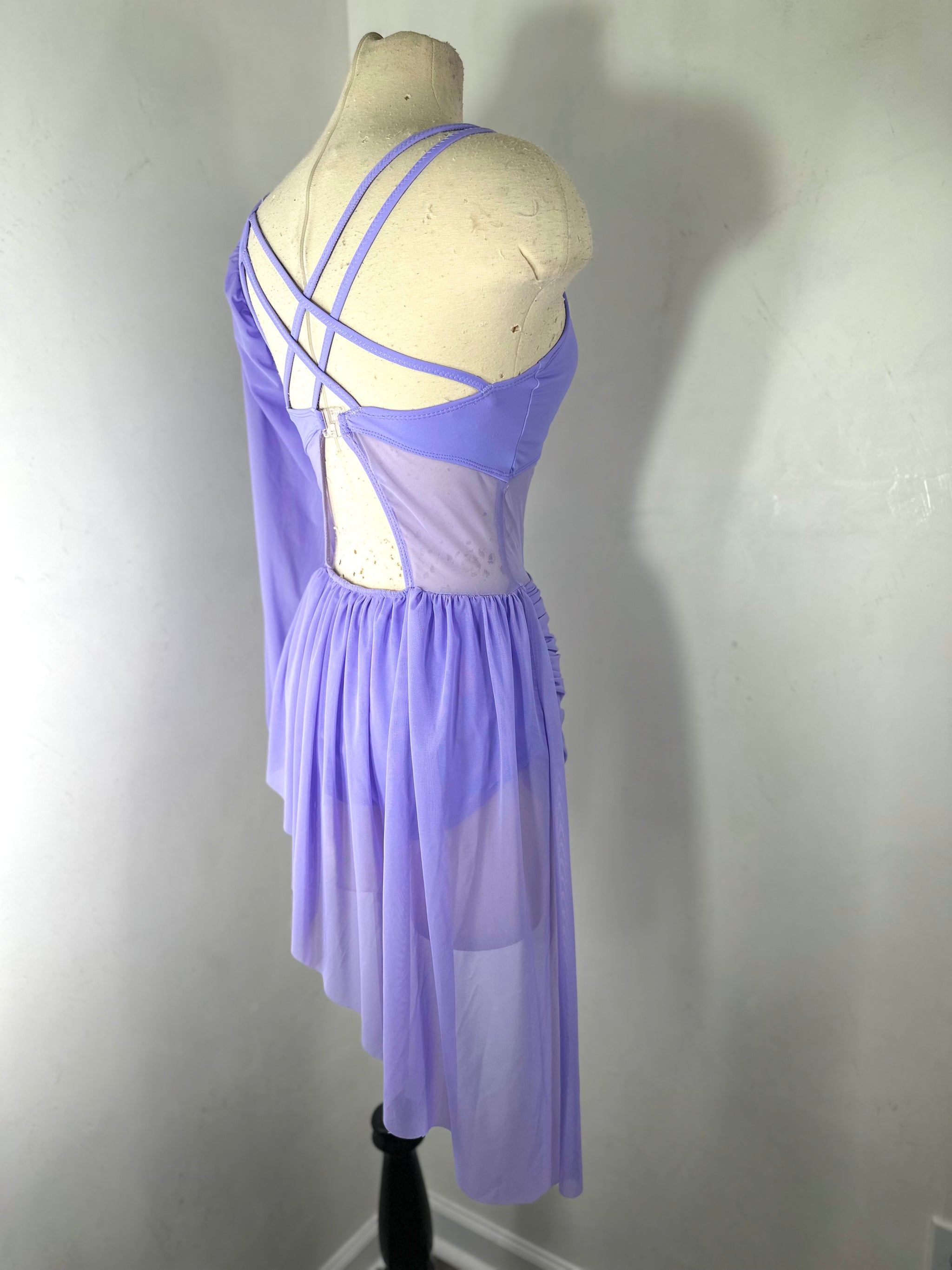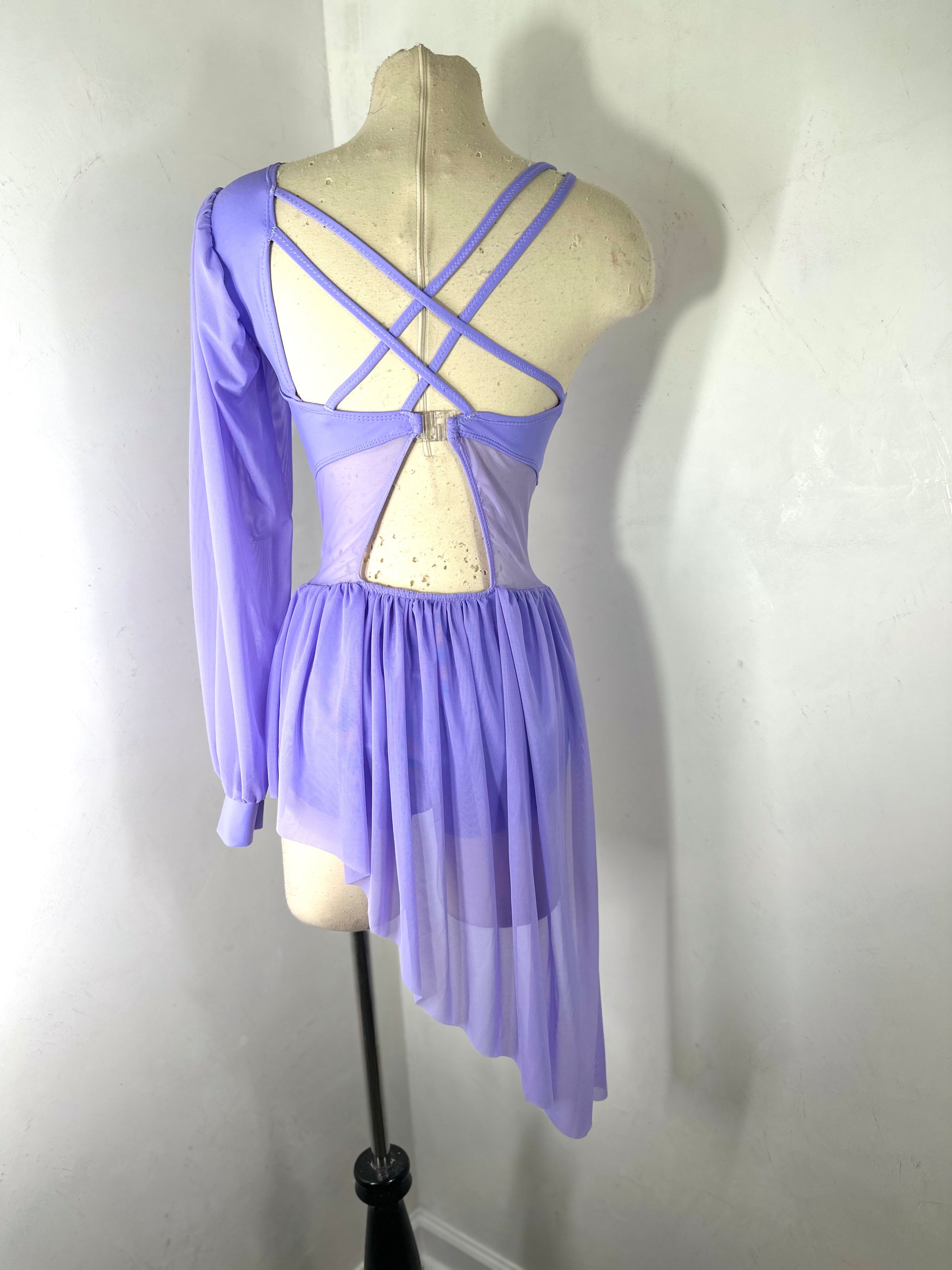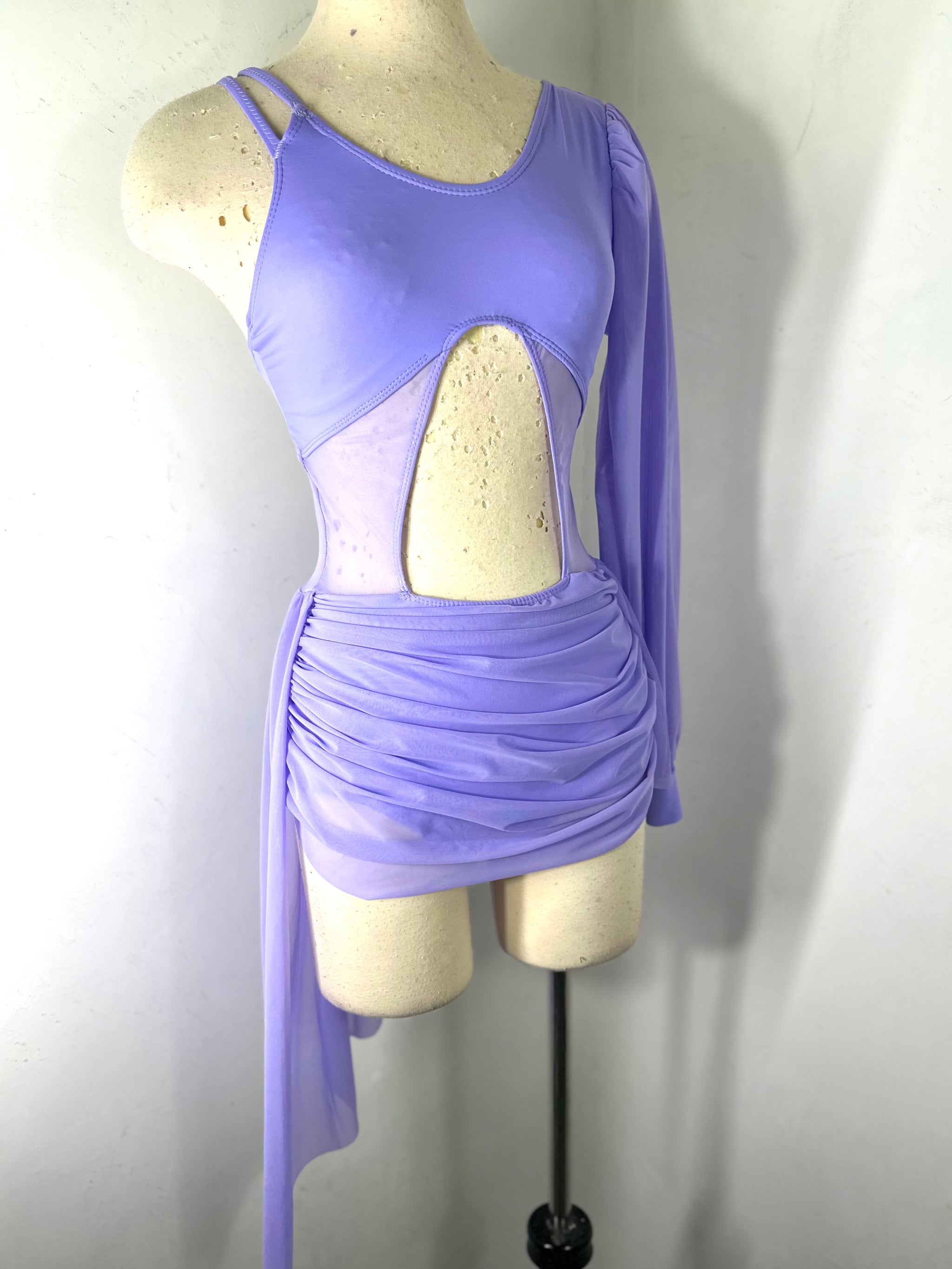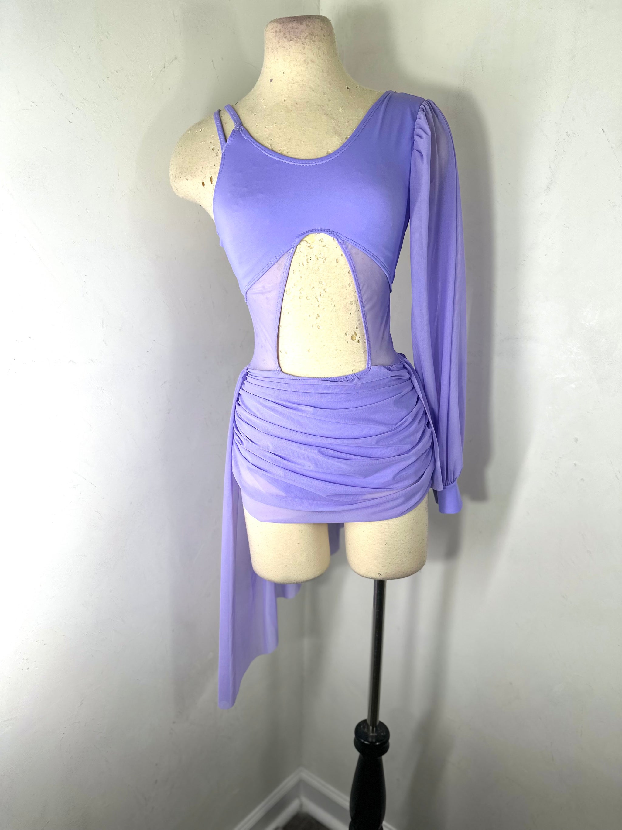 Evelyn Lyrical dance costume . Pretty plain lined base with shirred front skirt and assymetrical back skirt as well as one full sleeve and two sets of back straps.
