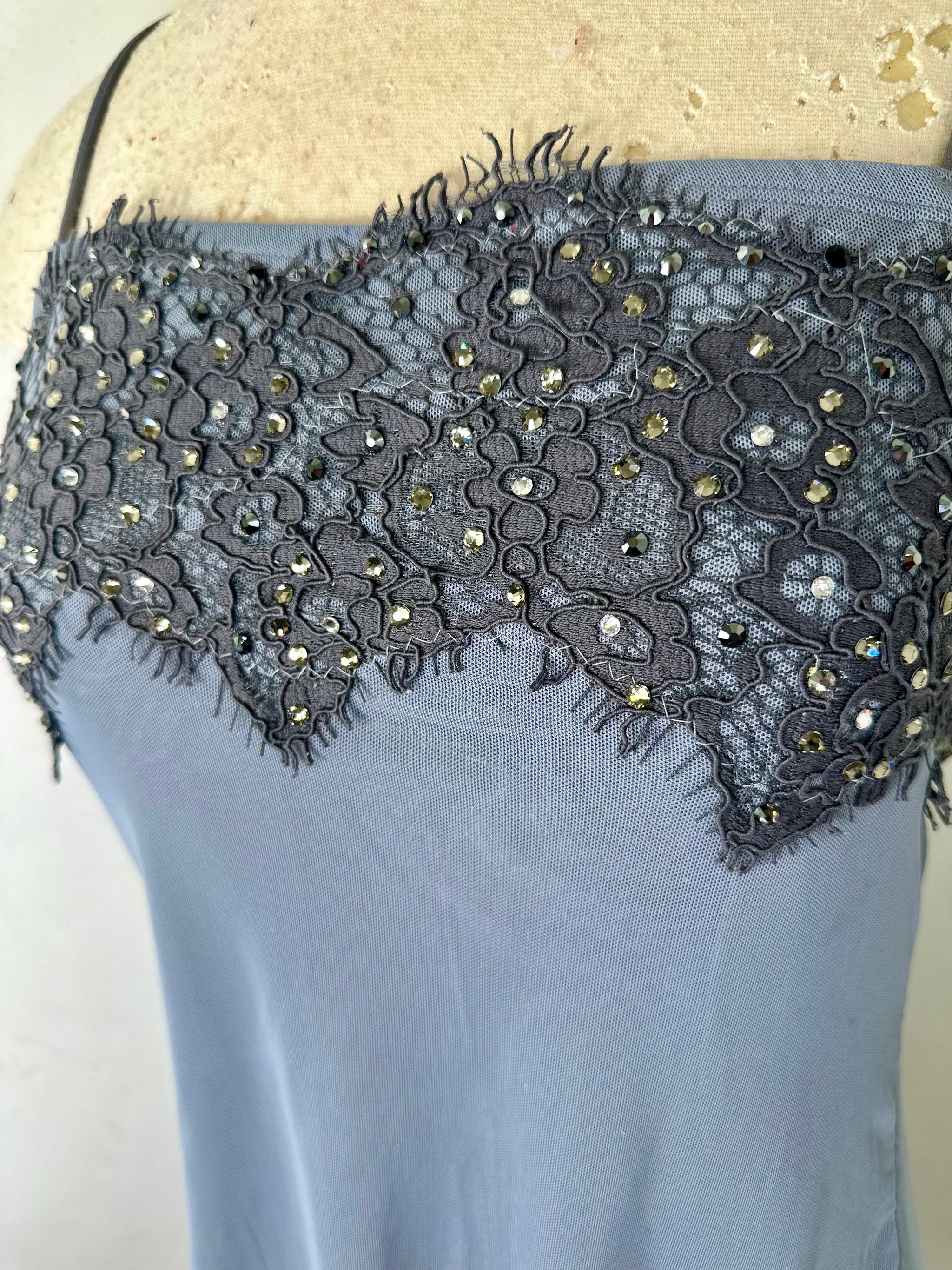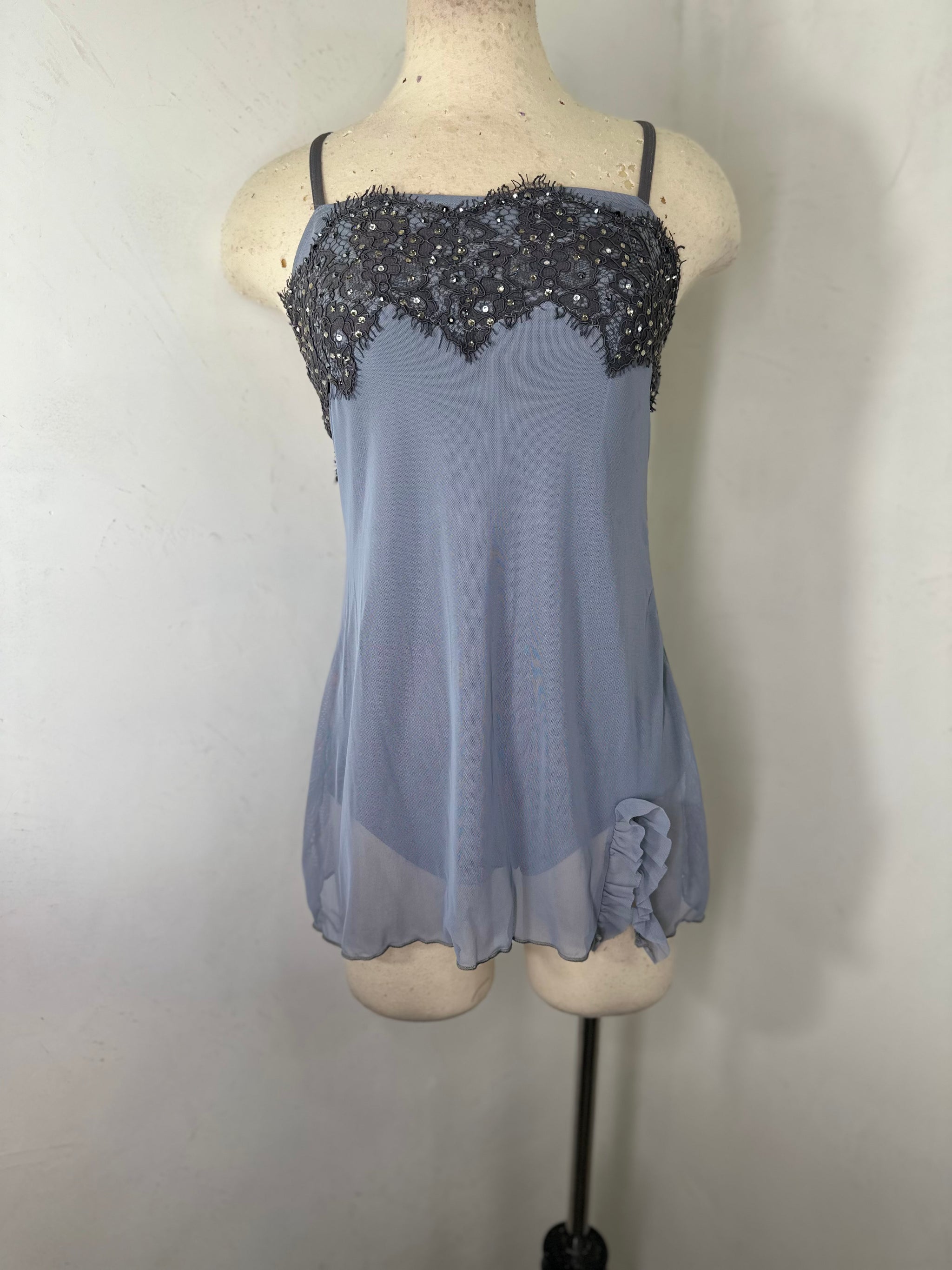 Ready to ship grey Lyrical dance dress with french alencon lace and Preciosa crystal ab rhinestones ,crystal rhinestones and pearls in several sizes.