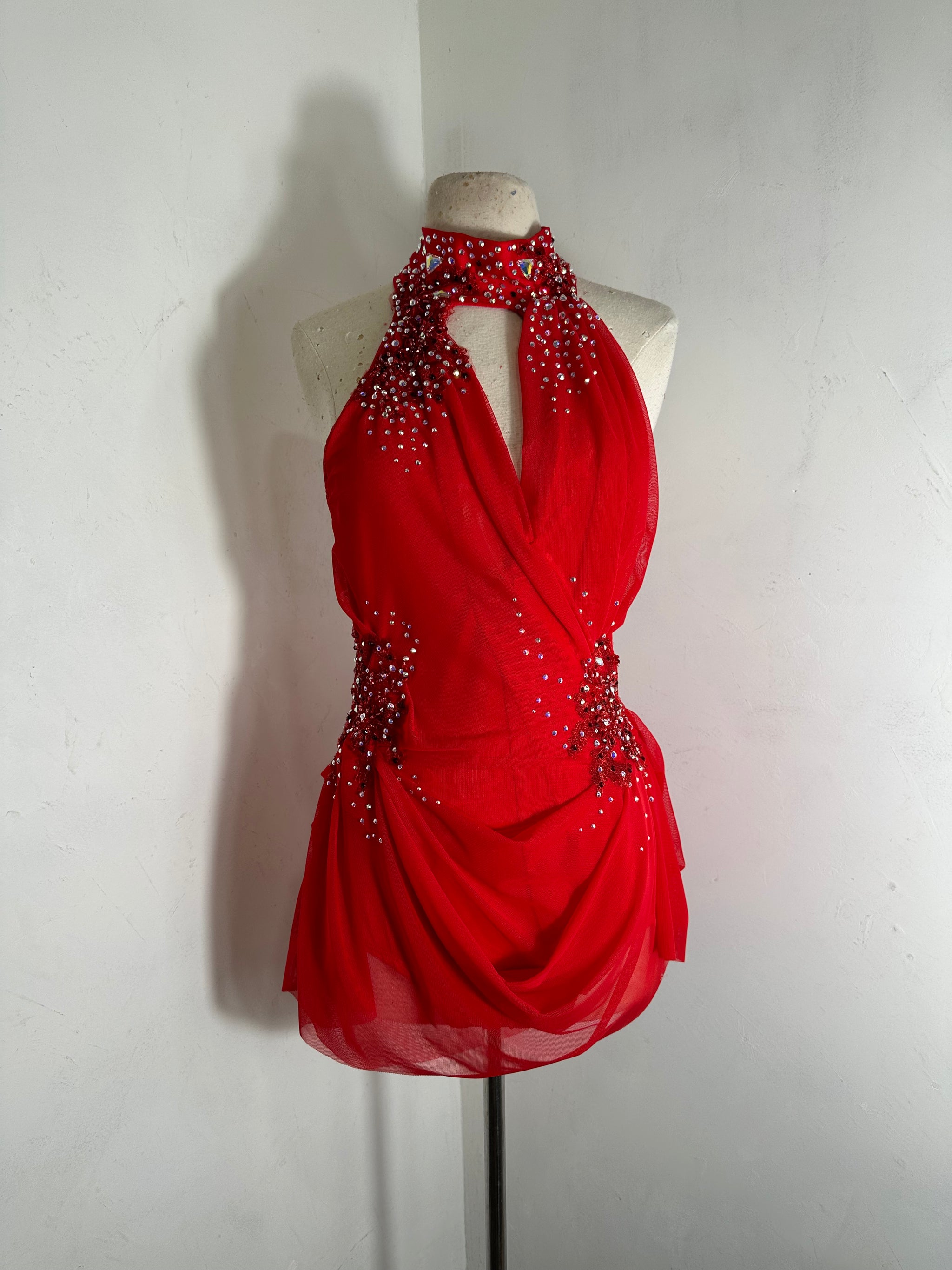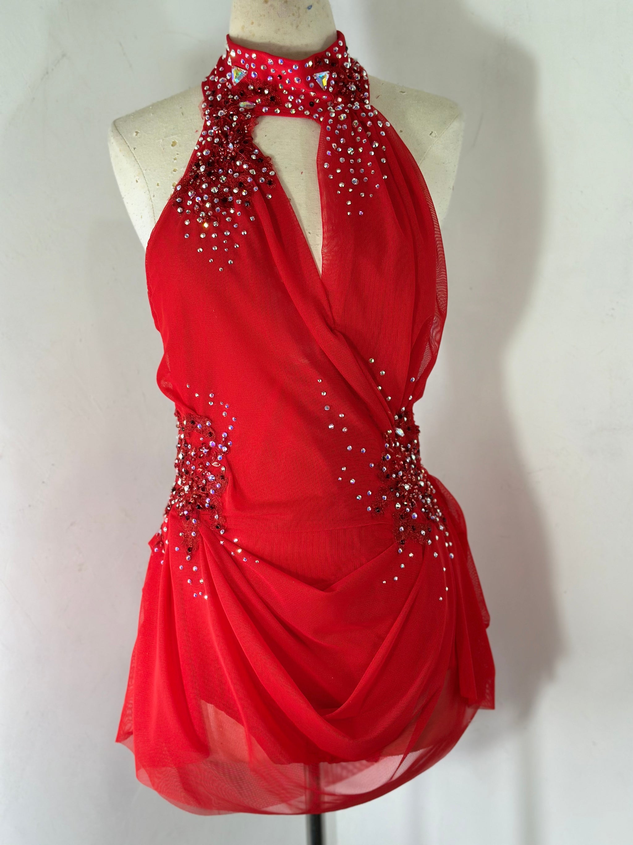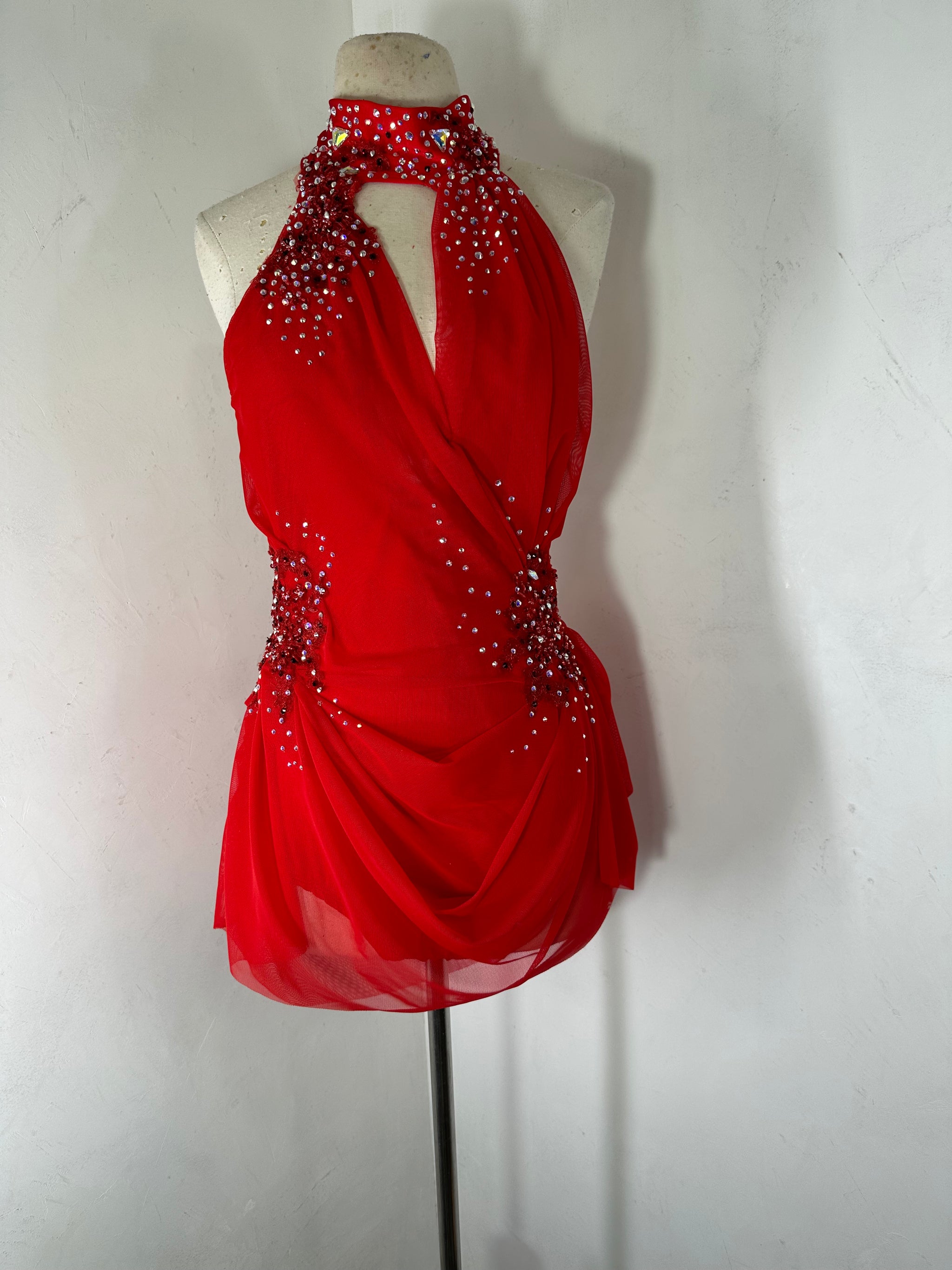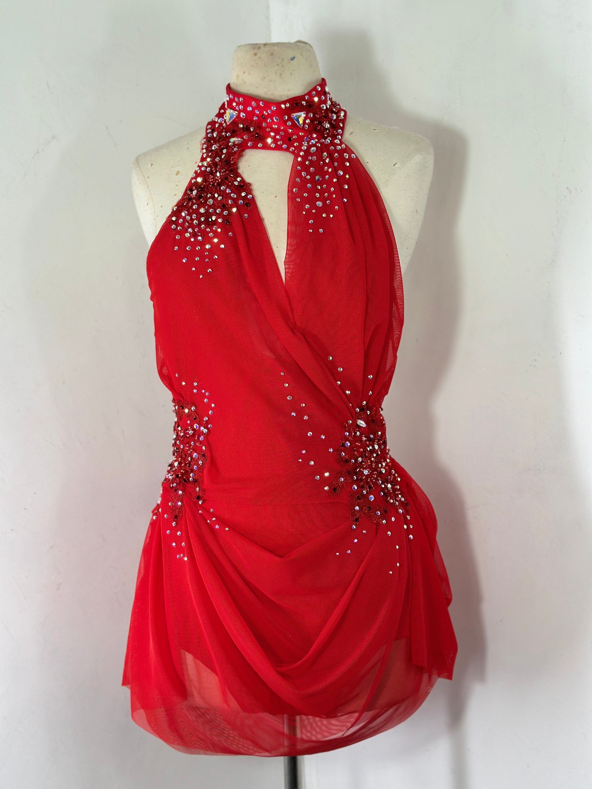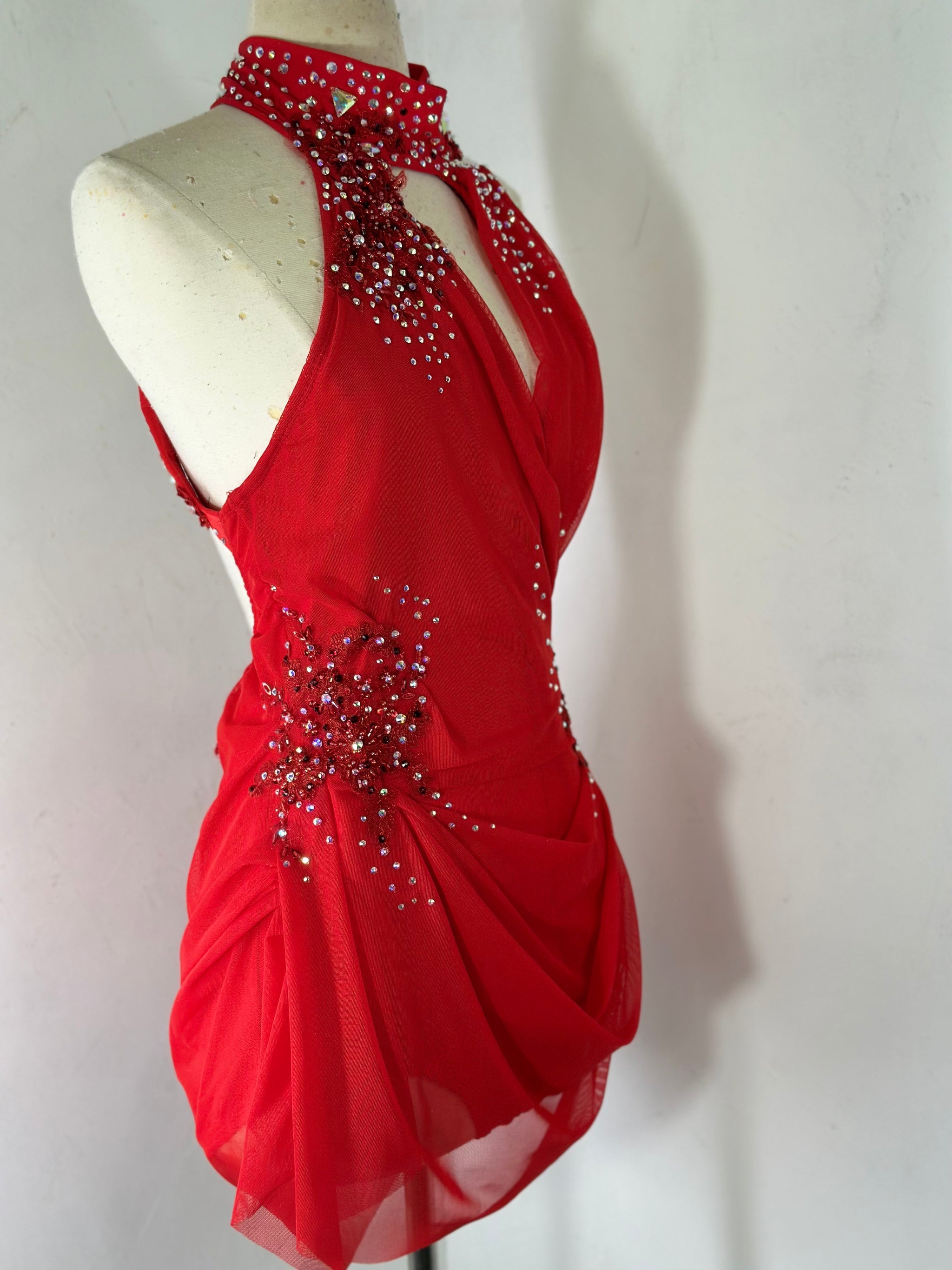 red beaded applique dance costume with preciosa crystal ab rhinestones in 4 sizes and hand sewn rhinestones.