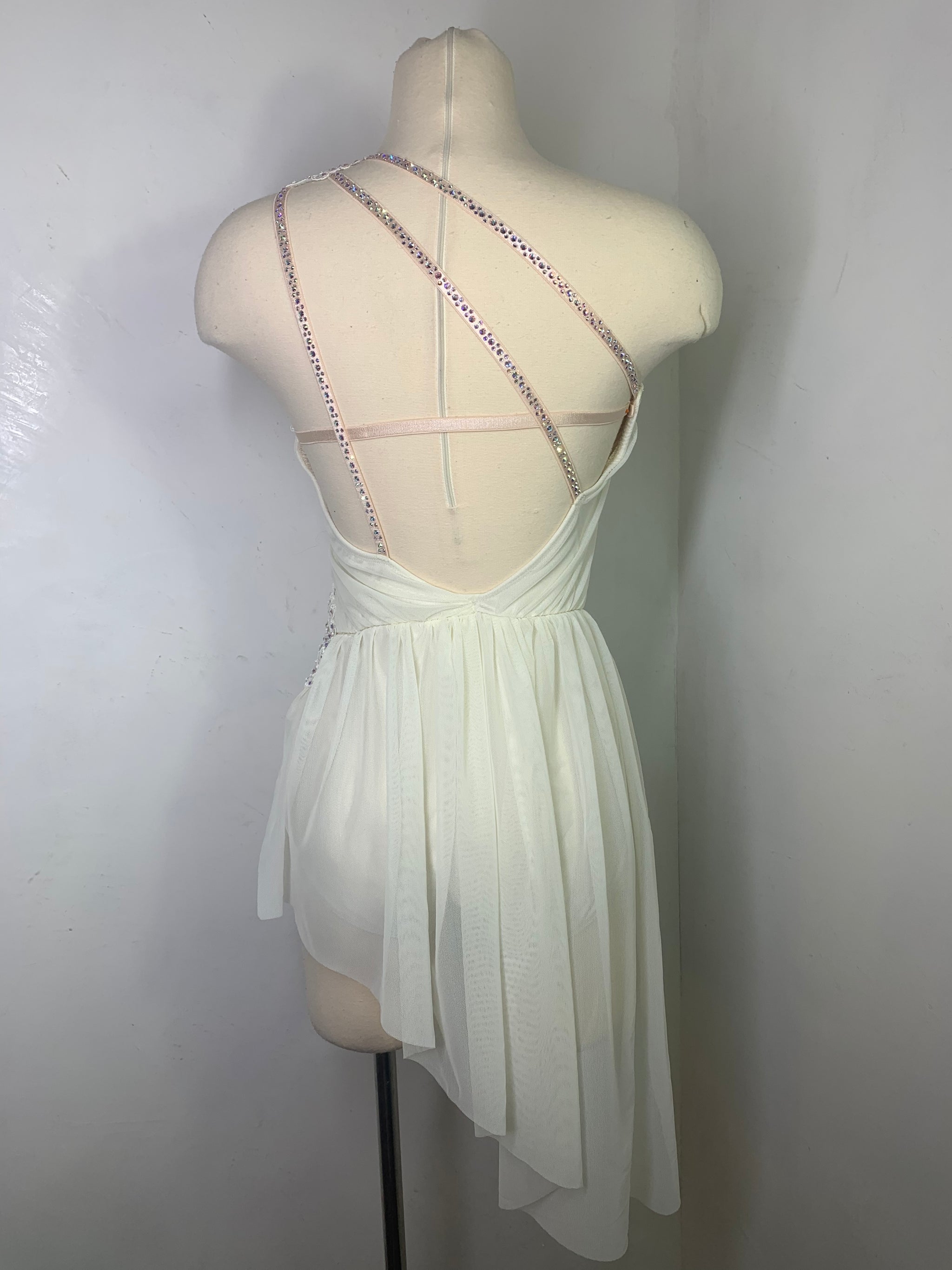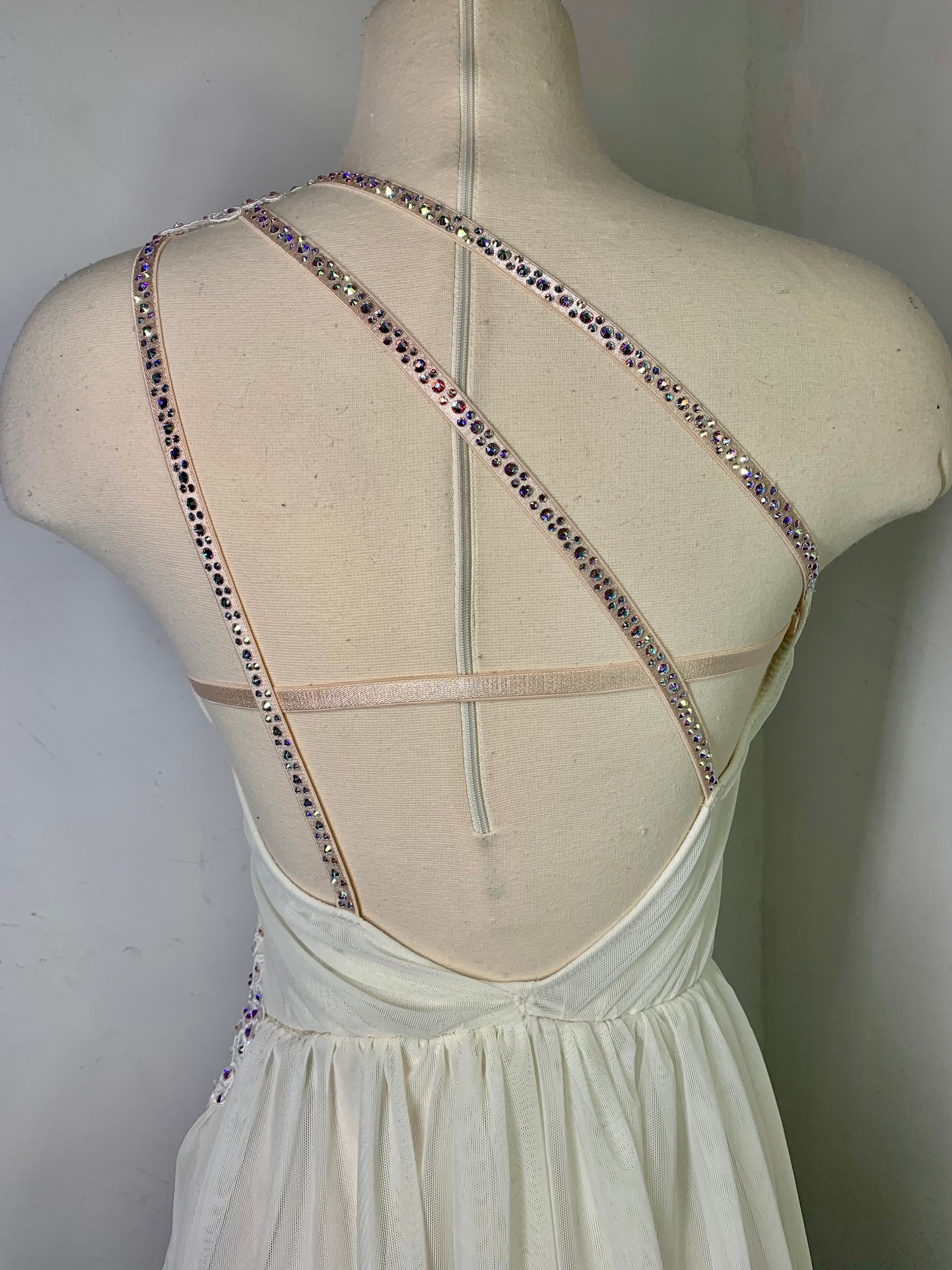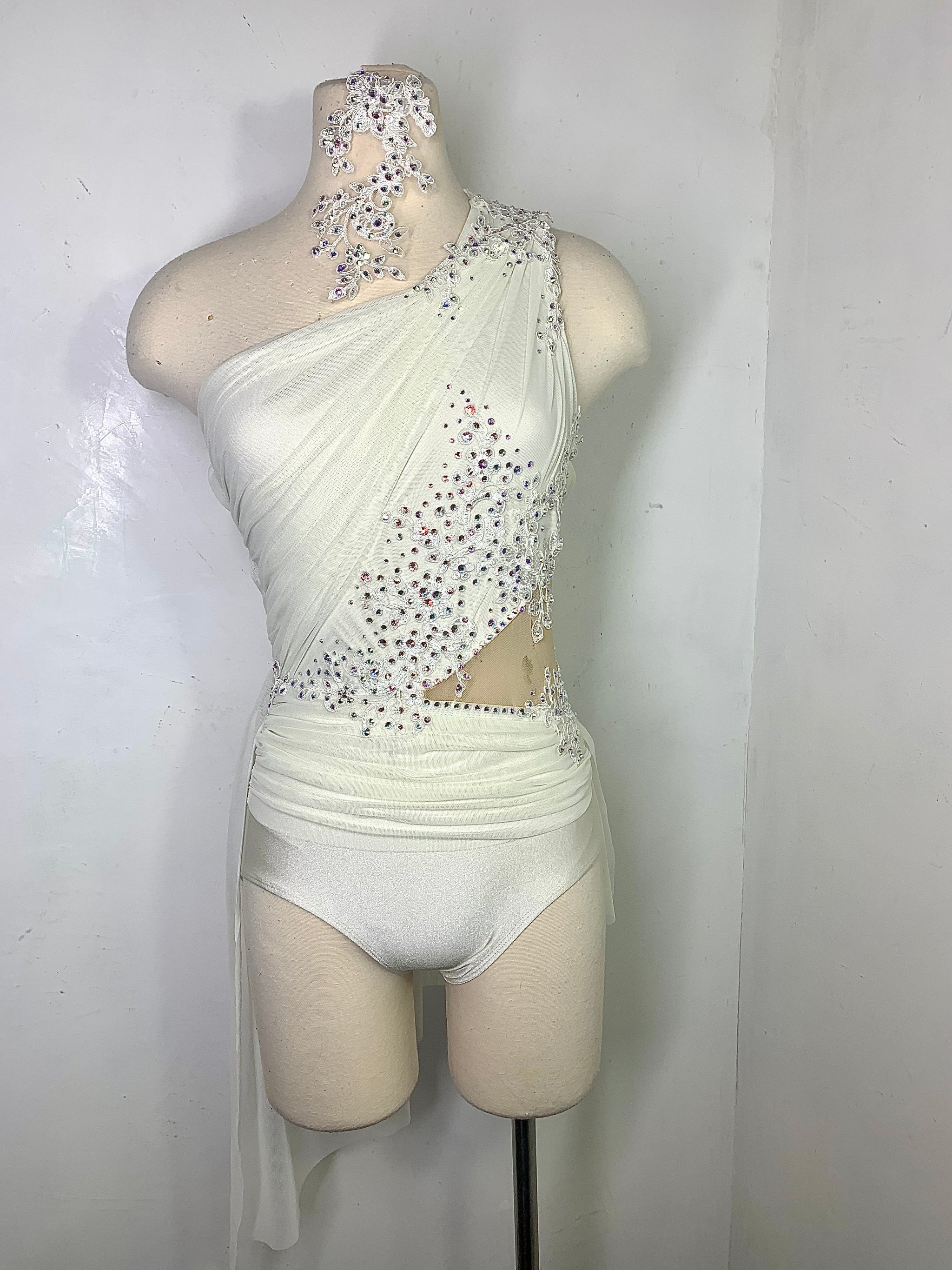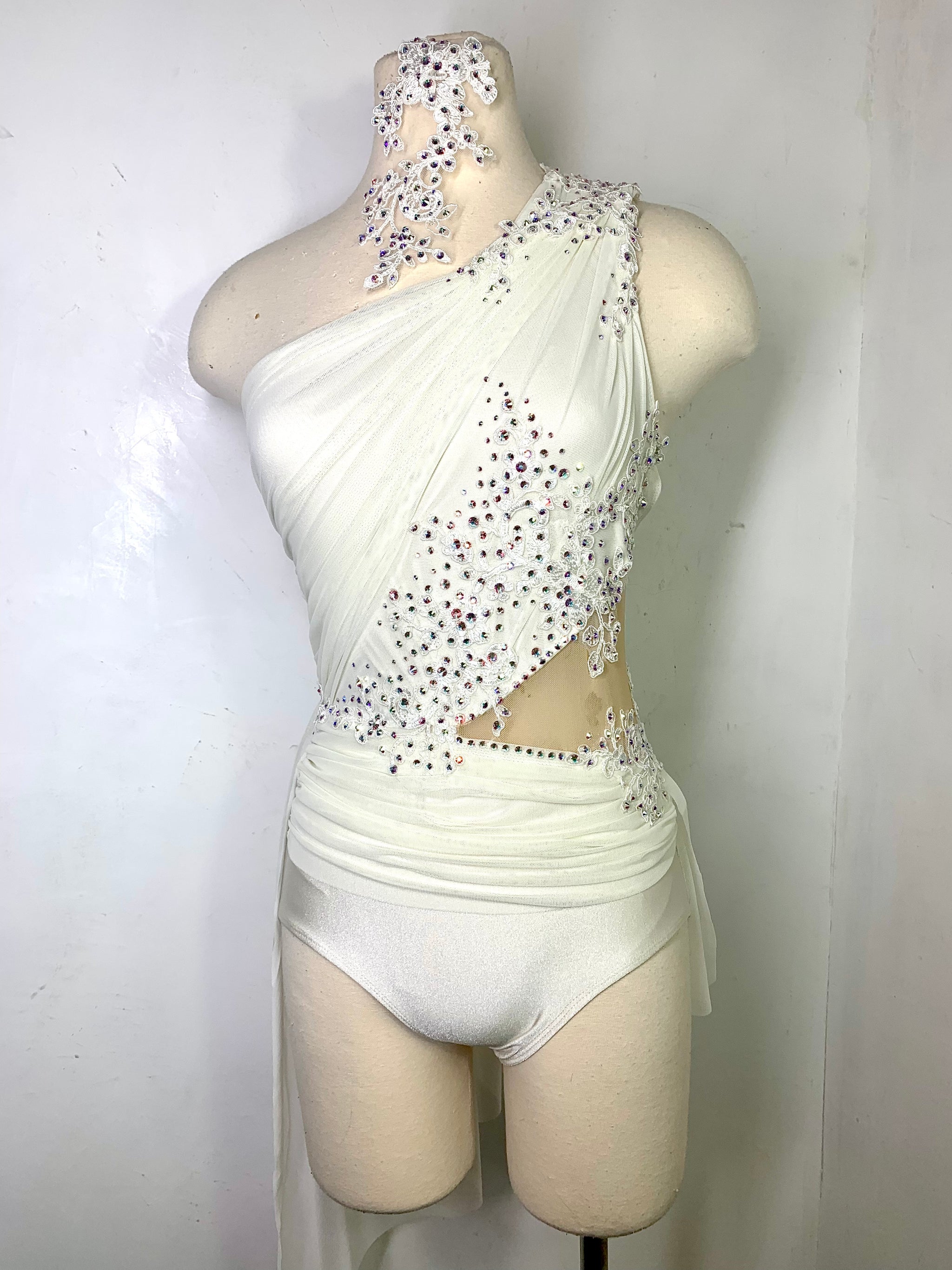 Ready to ship Ivory lyrical dance costume with alencon lace appliqies and 3 sizes of swarovski crystal ab rhinestones and matching headpiece. Ready to ship in size SA