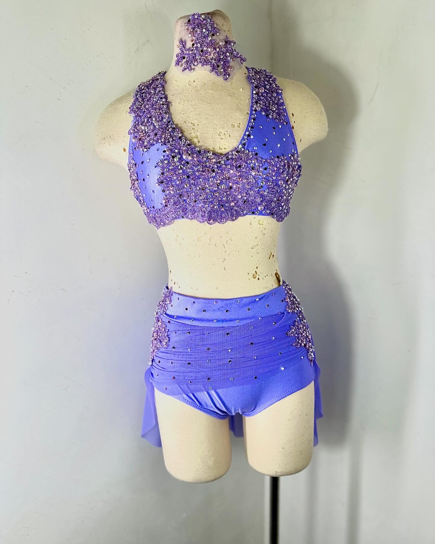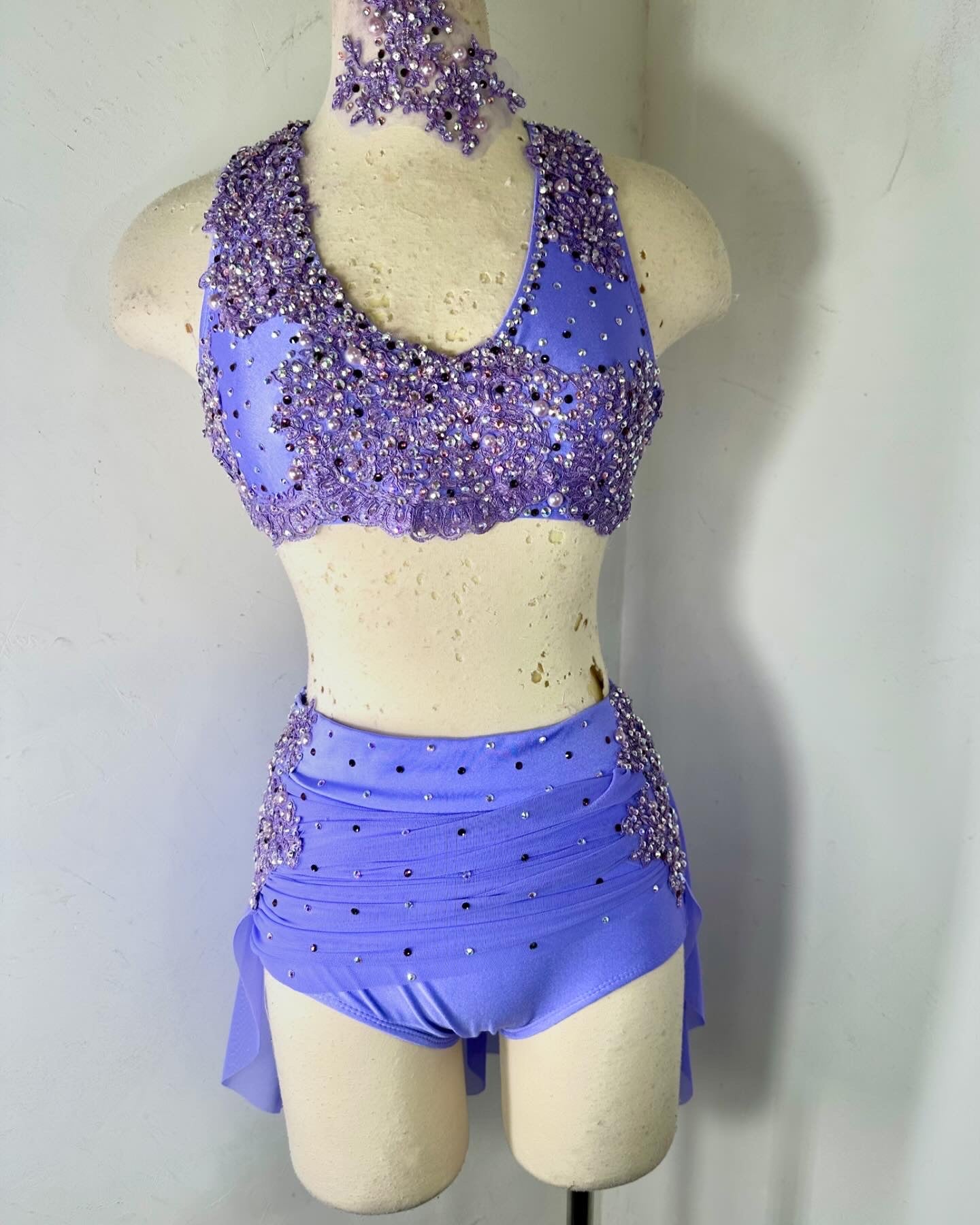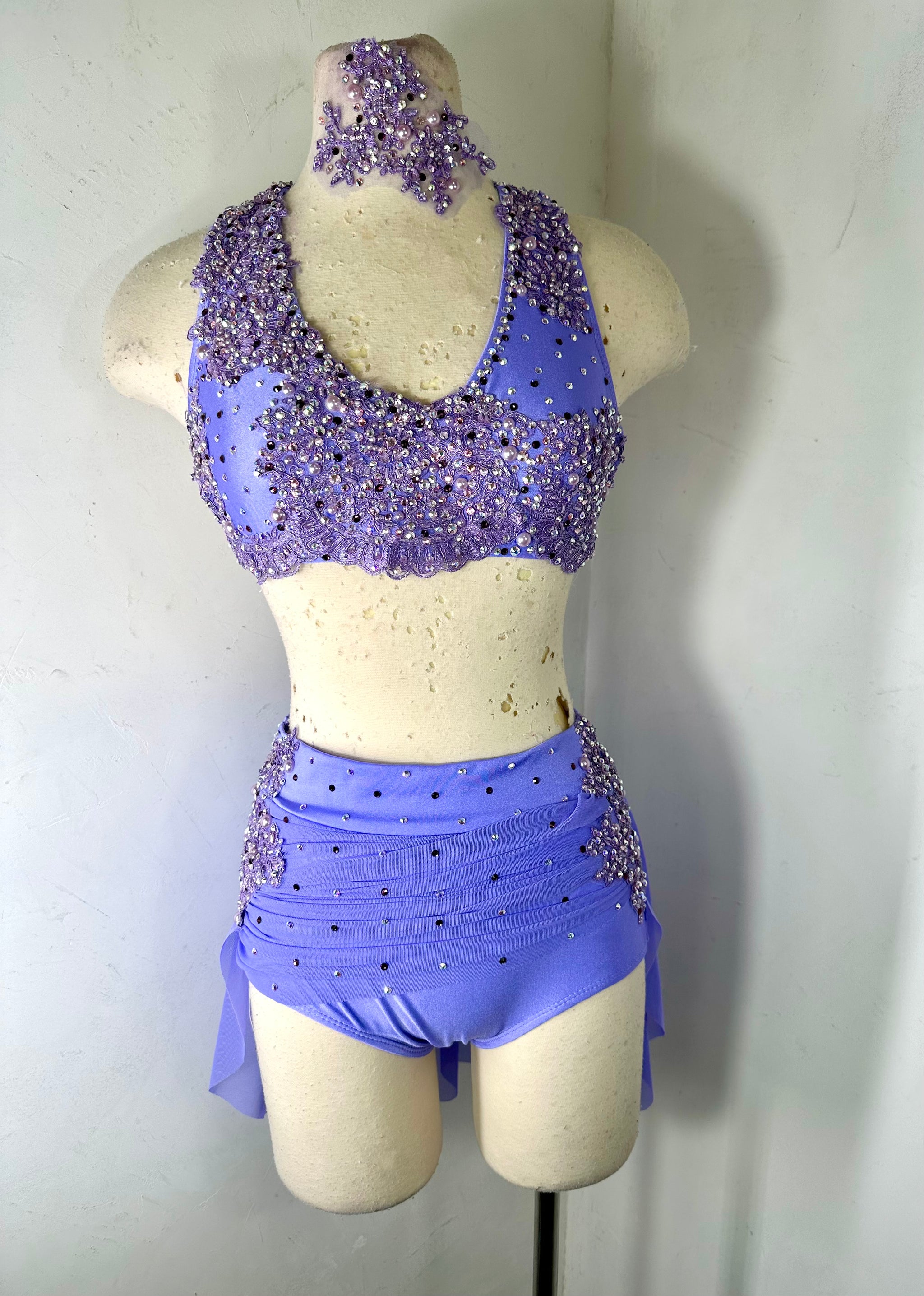 Gorgeous Lilac adult size lyrical dance costume with lilac appliques and over ten gross crystal ab preciosa rhinestones and additional orchid and rose ab rhinestones and pearls. this costume is fully lined underneath. headpiece included