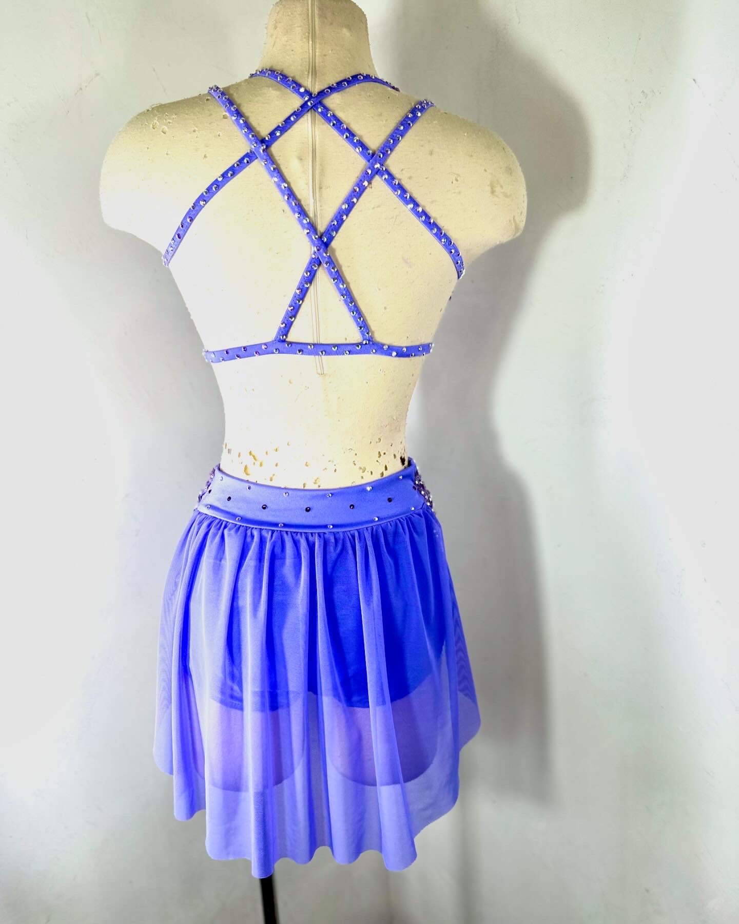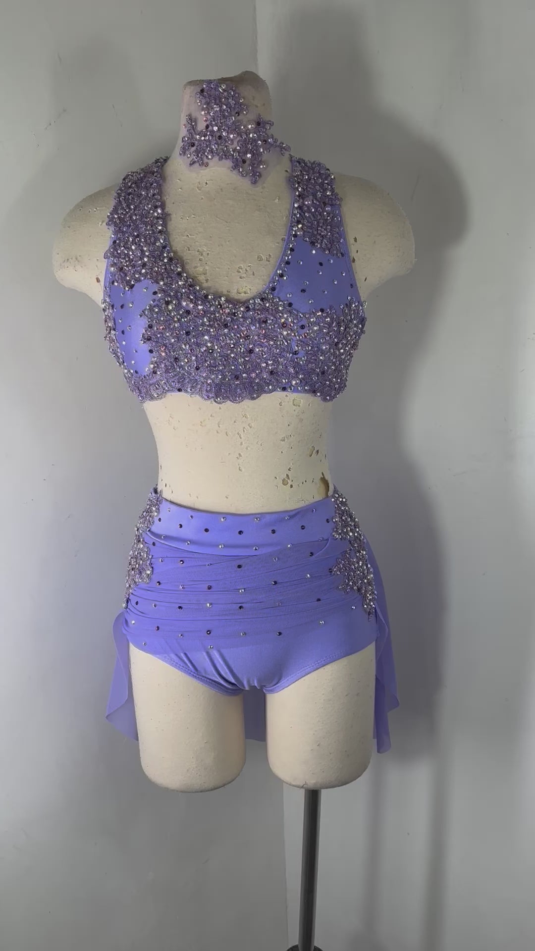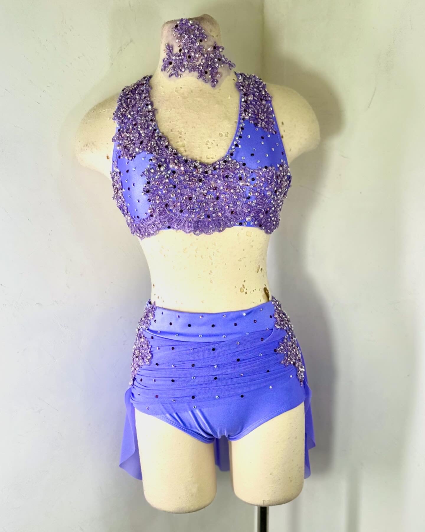 Gorgeous Lilac adult size lyrical dance costume with lilac appliques and over ten gross crystal ab preciosa rhinestones and additional orchid and rose ab rhinestones and pearls. this costume is fully lined underneath. headpiece included
