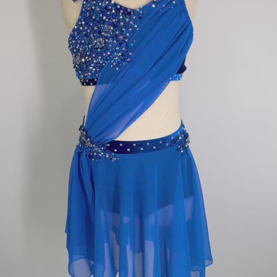 Best selling royal blue velvet appliqued dance costume with Preciosa rhinestones, sash and matching headpiece