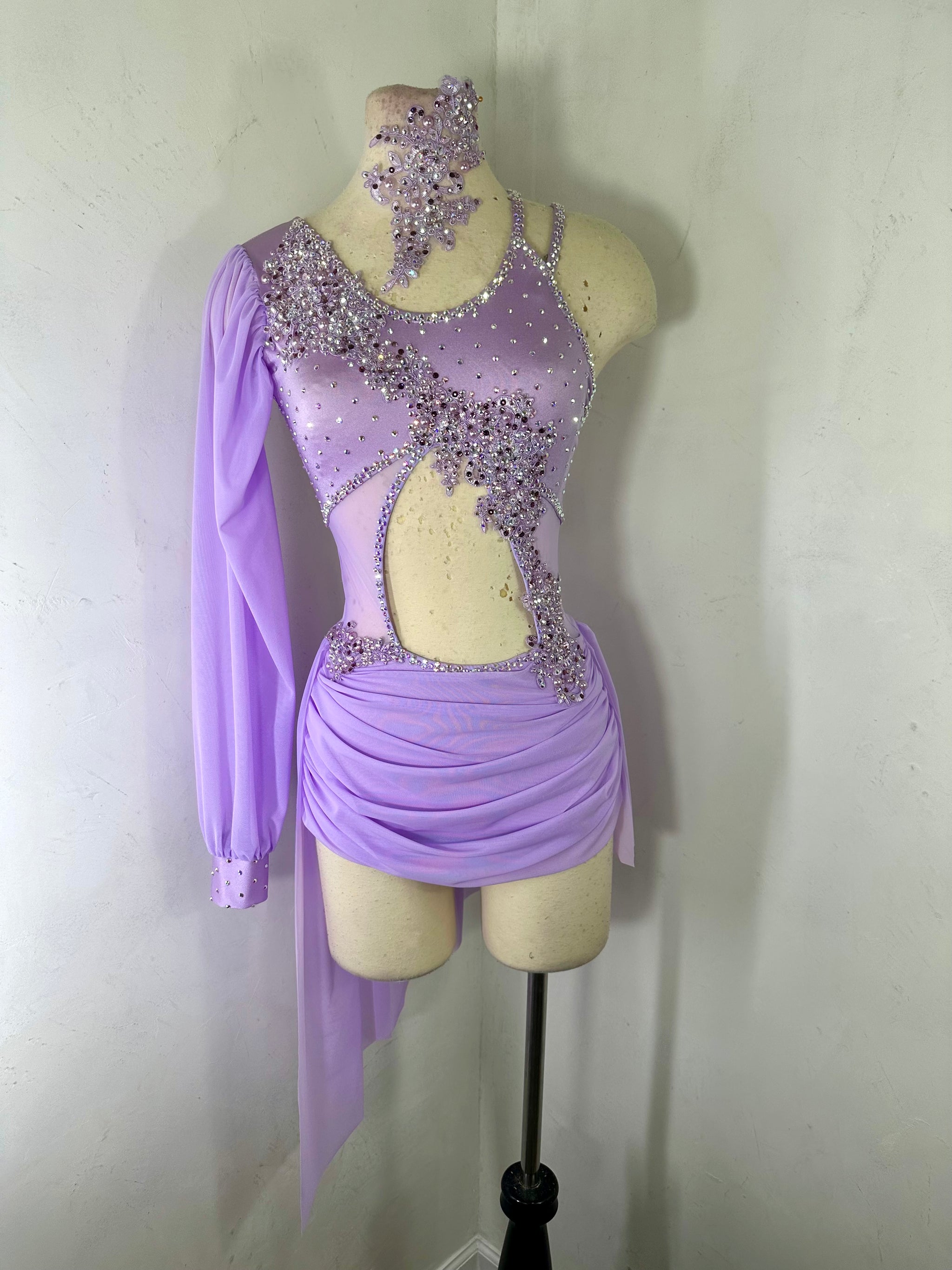 Lyrical dance costume with light orchid appliques and over ten gross crystal ab preciosa rhinestones and additional lilac and similar tones preciosa rhinestones, pearls and hand sewn crystal ab crystals. This one sleeved lyrical dance costume is fully lined underneath. You can request one sleeve as is or two.