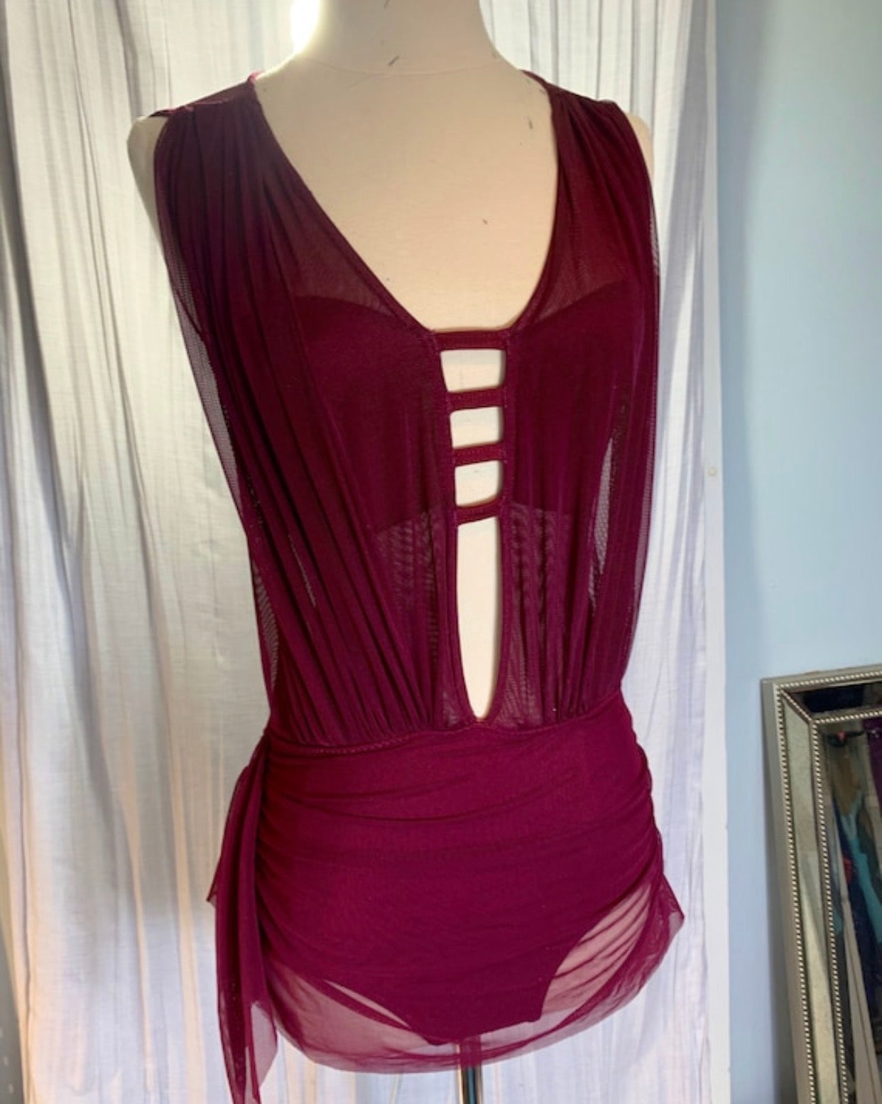 FOR EX. PLEASE NOTATE MESH INSERT AT CENTER FRONT OR NOT AND DRAPED SKIRT OR BACK SKIRT ONLY