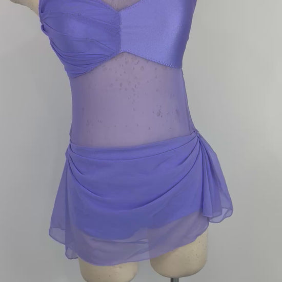 Evelyn Lyrical dance costume . Pretty plain lined base with shirred front skirt and assymetrical back skirt as well as one full sleeve and two sets of back straps.