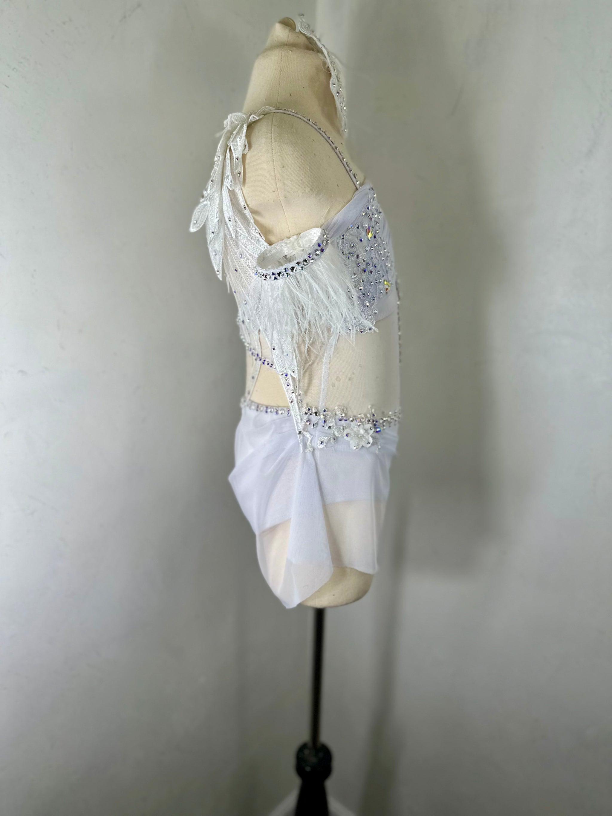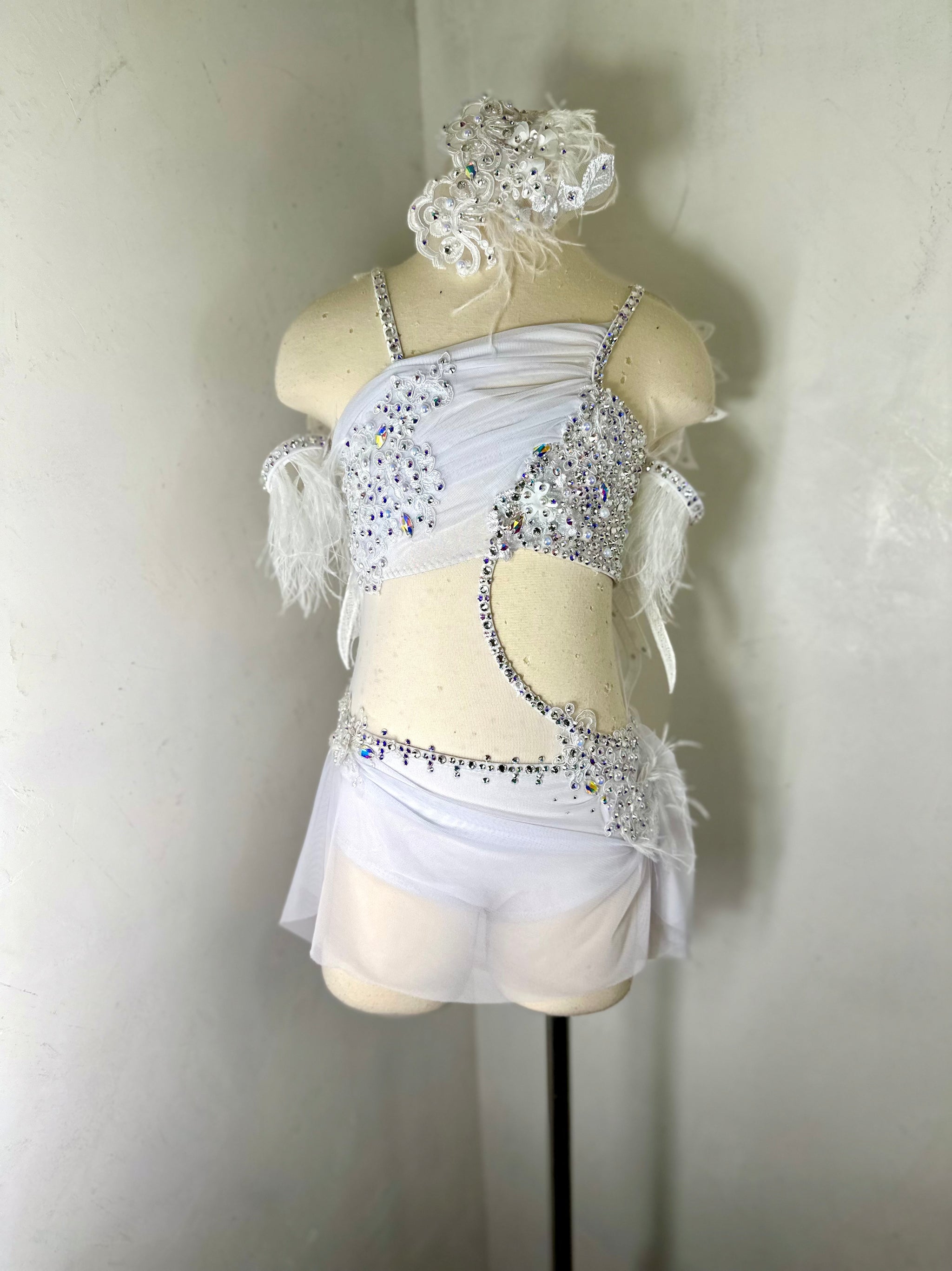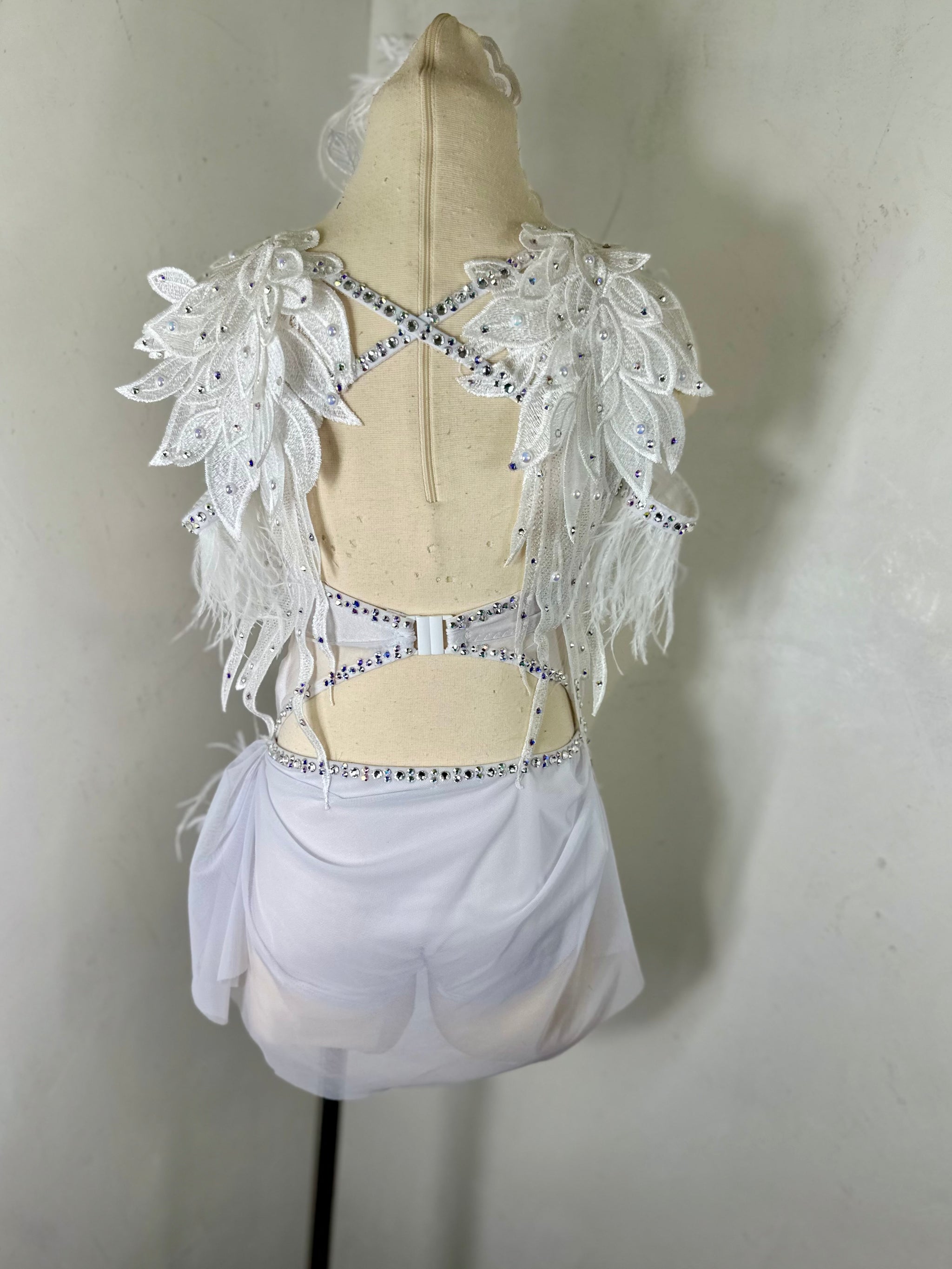 Eden white lyrical dance costume with appliques and wings and ostritch feather trim and preciosa crystal and crystal ab and pearl ab rhinestones and pearls.
