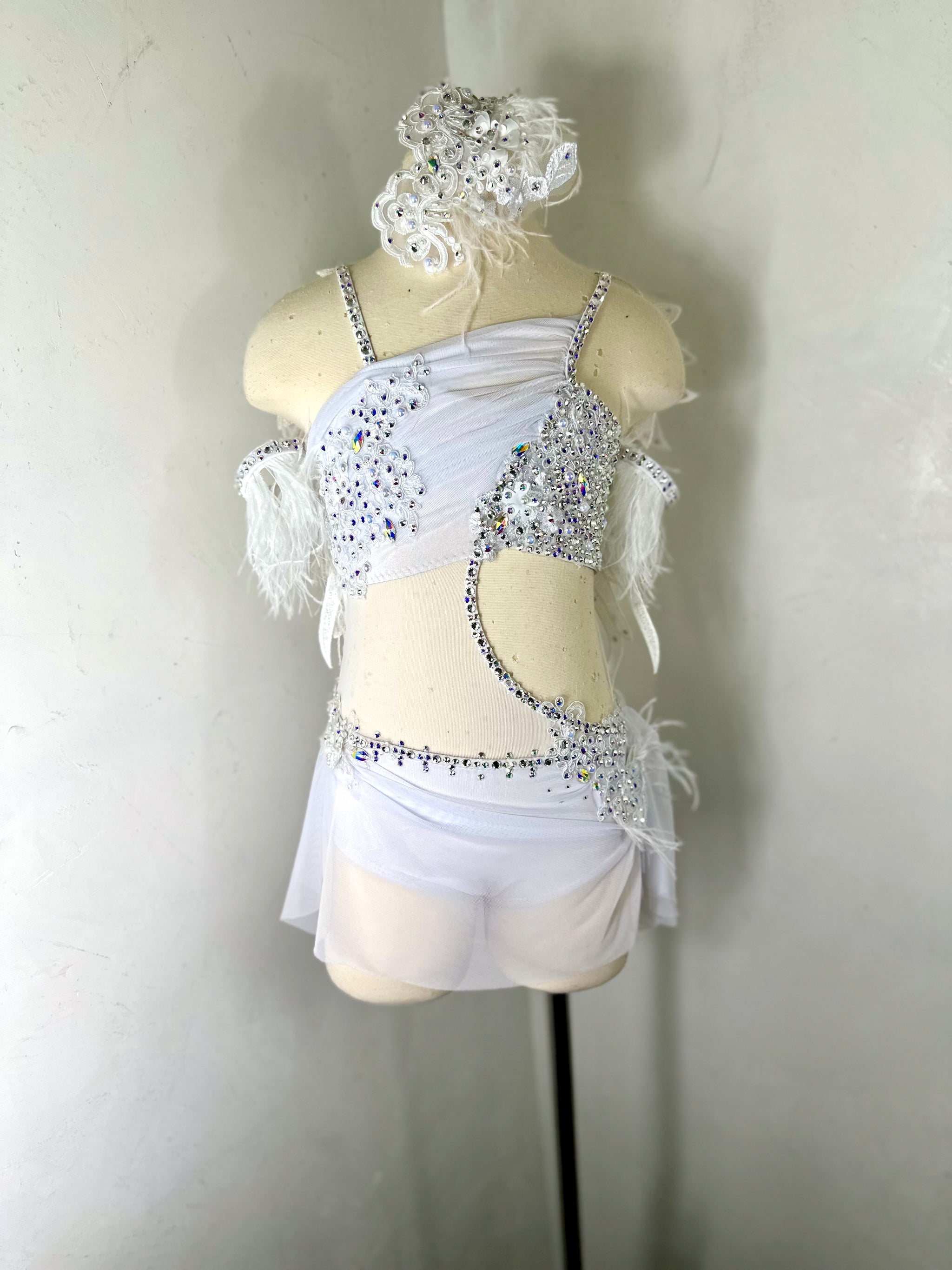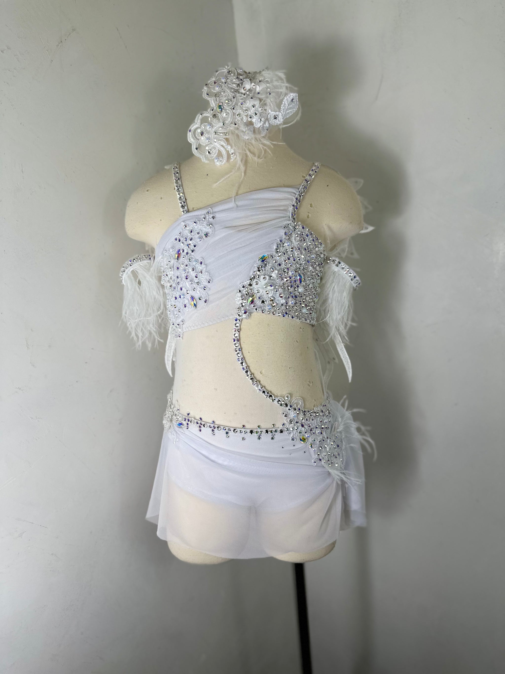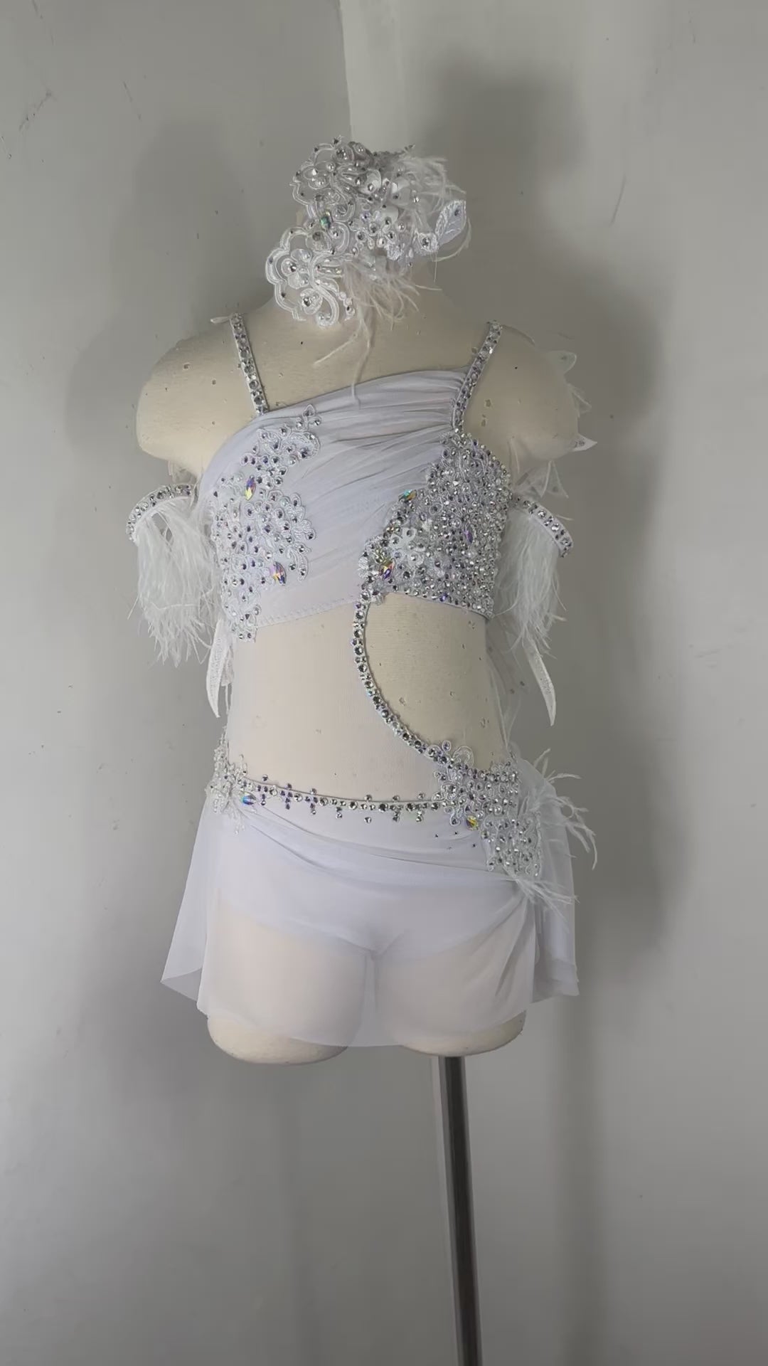 Eden white lyrical dance costume with appliques and wings and ostritch feather trim and preciosa crystal and crystal ab and pearl ab rhinestones and pearls.